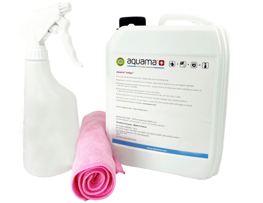 Un Bidon Aquama de 5L : Pré-rempli avec la solution Indigo, une formule unique capable de nettoyer et désinfecter toutes les surfaces sans effort.