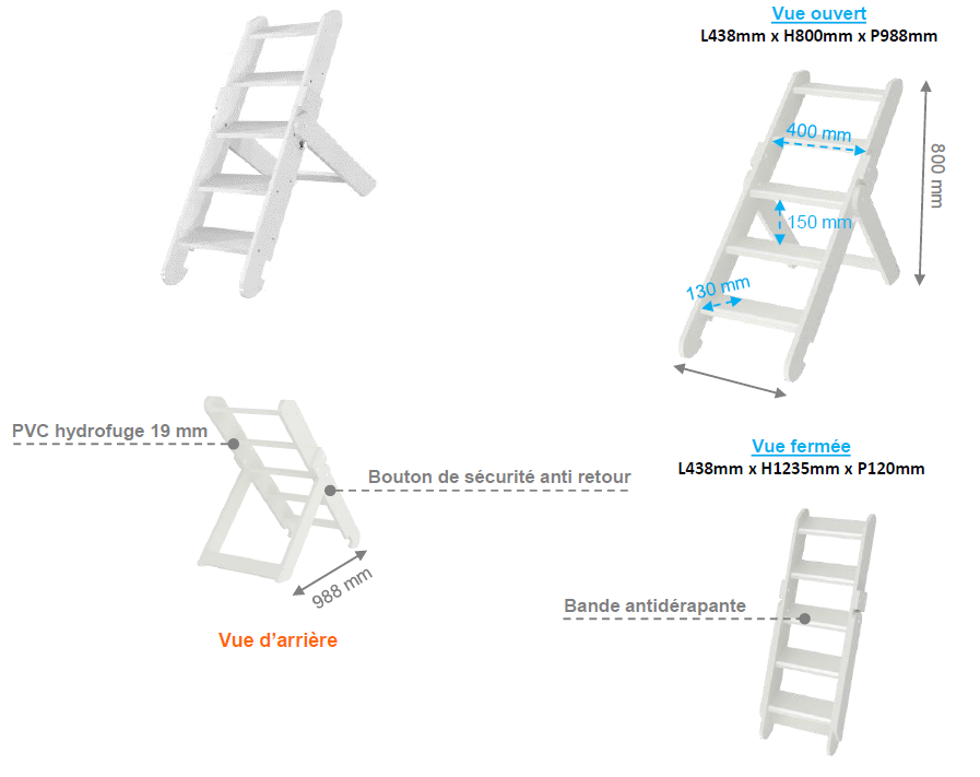 Matériaux : Structure, marches, bande et pieds arrière en PVC hydrofuge 19 mm, chants en ABS