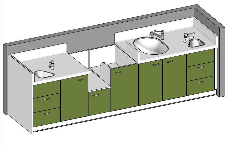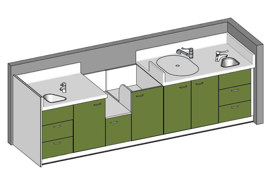 Meuble à langer 1 baignoire, 2 lavabos, 1 change debout - 330 cm