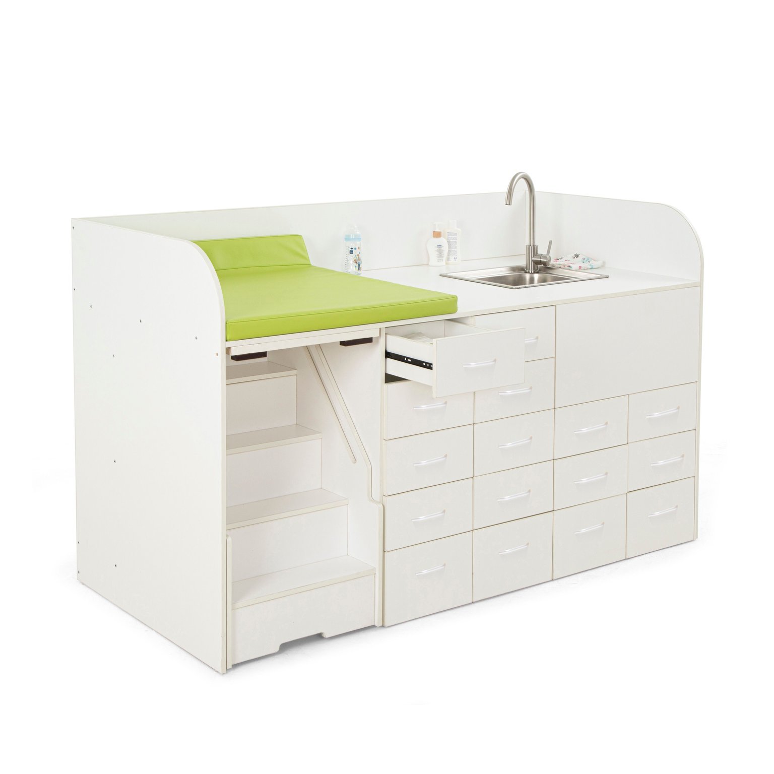 Avec une hauteur d’escalier de 88 cm et une largeur de 52 cm, cet équipement favorise un accompagnement en douceur des enfants lors du moment du change. L’extension de l’escalier (55 cm) permet un accès stable et sécurisé. Le plan à langer, d’une profondeur de 88 cm, offre une surface confortable pour allonger l’enfant et effectuer les soins en toute sérénité.