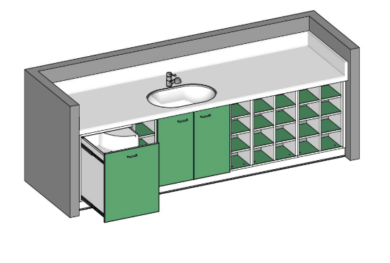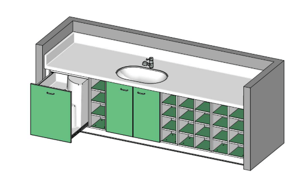 La cuve en résine polyester finition gel coat RAL9010 offre une surface résistante, facile à nettoyer et durable. Les dosserets latéraux et arrière de 150 mm assurent une excellente protection contre les éclaboussures, renforçant ainsi l’hygiène et la sécurité lors du change. Le mobilier intégré en panneaux mélaminés avec chants PVC 2 mm garantit une grande robustesse et une finition soignée.