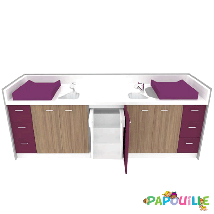 Son format généreux (2450 mm de longueur) permet une utilisation simultanée par plusieurs professionnels tout en respectant les normes sanitaires. Le meuble est livré complet avec un ensemble de rangements modulables : tiroirs, portes, étagères et même un escalier escamotable intégré, facilitant l’accès des enfants en toute sécurité – un atout majeur pour les équipes encadrantes.