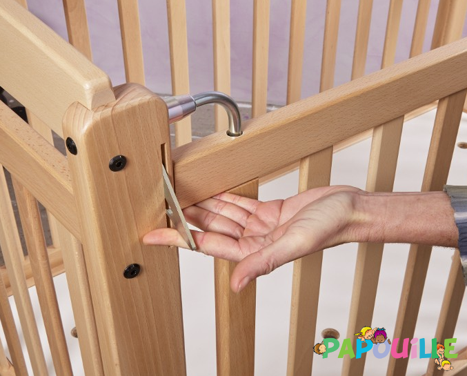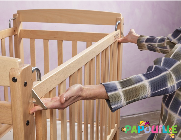 Lit pour crèche et collectivités en bois massif avec sommier réglable sur 3 hauteurs et barrière mobile qui dispose d'un verrouillage de sécurité !