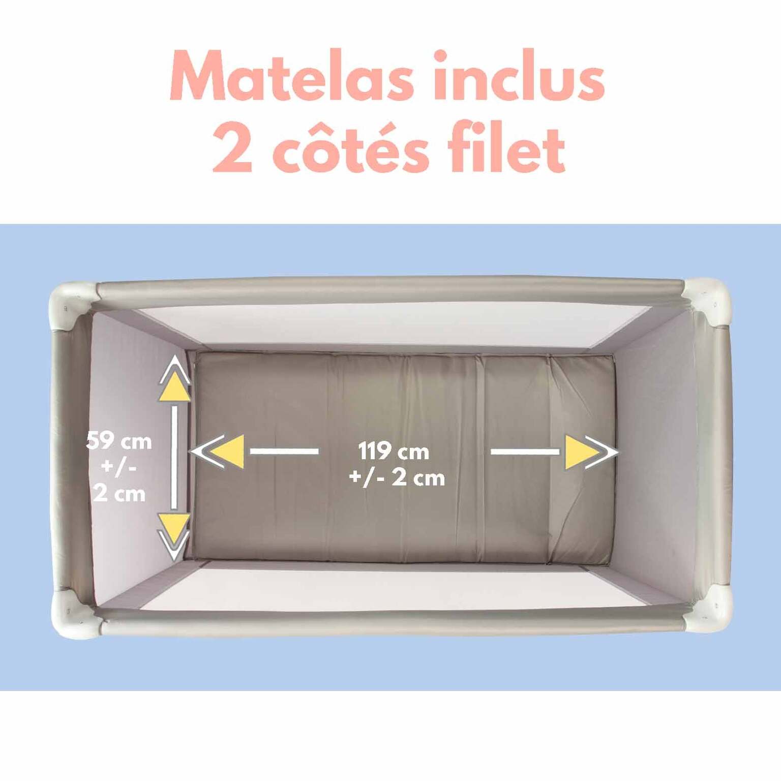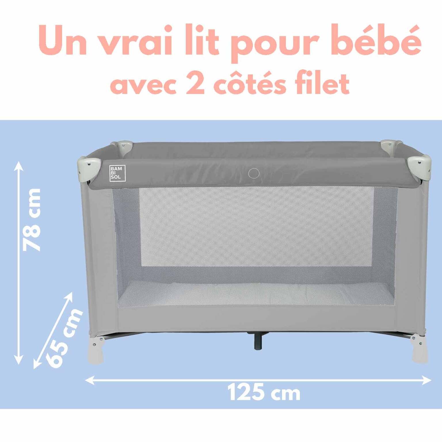 Les deux côtés en filet permettent de surveiller facilement le bébé tout en lui offrant la possibilité d’observer son environnement, tandis que les deux côtés pleins le protègent de l’excès de lumière, favorisant un sommeil calme et réparateur.