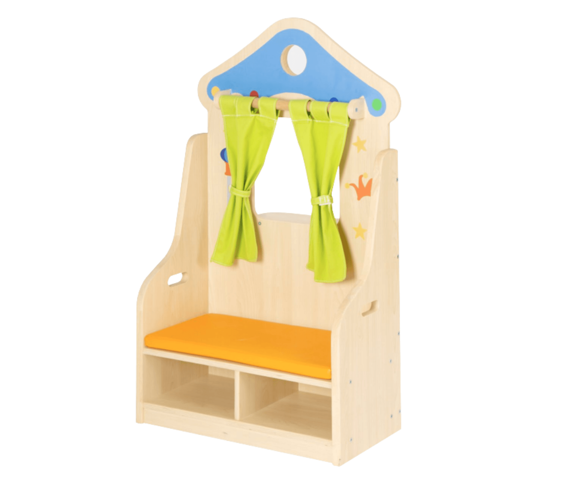 Grâce à son rideau textile coulissant, les petits artistes peuvent créer des spectacles captivants, jouer les présentateurs de journal télévisé ou inventer leurs propres histoires. Le siège rembourré intégré permet aux enfants de s’installer confortablement, favorisant ainsi des heures de jeu et d’apprentissage.