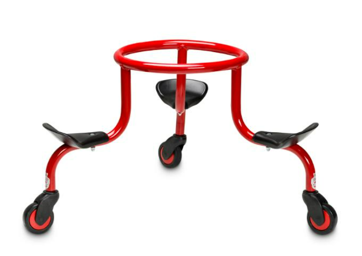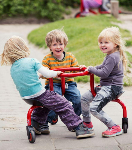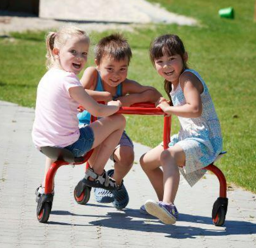Résistant aux intempéries, doté de pédales, poignées et roues en caoutchouc il est conçu pour accueillir de 1 à 3 enfants.