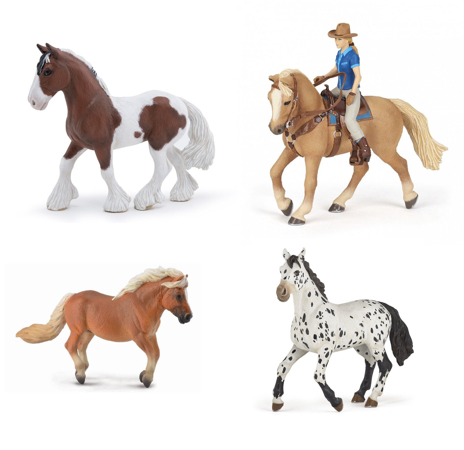 Imaginez une balade imaginaire avec la Jument Tinker, ses dimensions de 15 x 4,5 x 12,5 cm évoquant une élégance naturelle et une force tranquille. Ou partez pour une chevauchée audacieuse avec le Cheval Appaloosa noir (13 x 4 x 9 cm), symbole de liberté et de puissance. La CowGirl et son cheval (10 x 16 x 19 cm) invitent à des récits de courage et d'aventure, tandis que le robuste Cheval comtois (15 x 4 x 13 cm) raconte des histoires de loyauté et de travail acharné.