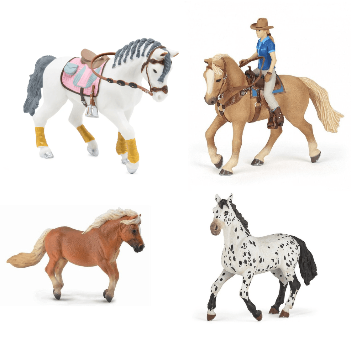 Imaginez une balade imaginaire avec la Jument Tinker, ses dimensions de 15 x 4,5 x 12,5 cm évoquant une élégance naturelle et une force tranquille.La figurine cheval tressé Papo se distingue par le soin apporté aux détails : tapis de selle, enrênement précis, posture harmonieuse.(14,5 x 5 x 9,5 cm). La CowGirl et son cheval (10 x 16 x 19 cm) invitent à des récits de courage et d'aventure, tandis que le robuste Cheval comtois (15 x 4 x 13 cm) raconte des histoires de loyauté et de travail acharné.