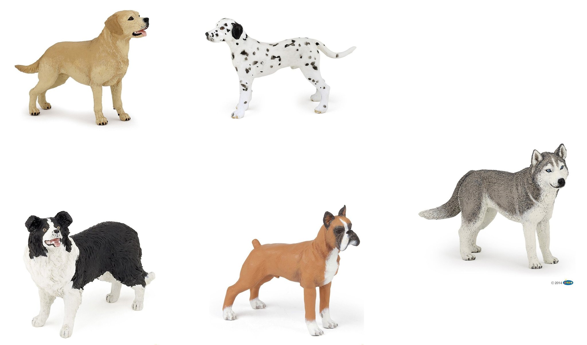Ce lot comprend 5 figurines : Border Collie, Boxer, Dalmatien, Labrador, Husky de Siberie