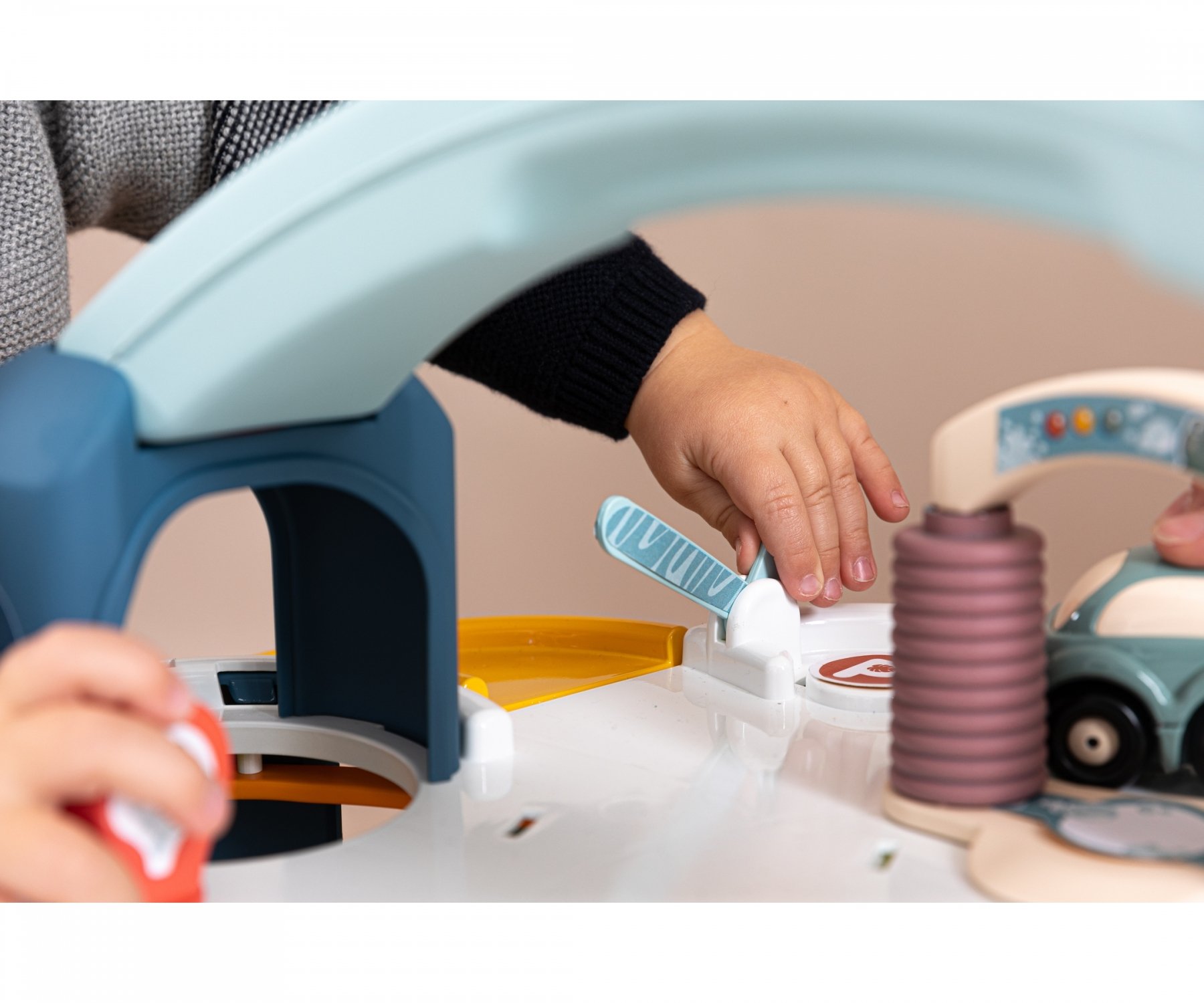 Facile à manipuler et à transporter, le garage est équipé d’une poignée ergonomique sur le dessus, idéale pour les crèches et les espaces de jeu partagés. Grâce à son bac de rangement intégré, les pistes se rangent facilement, favorisant ainsi l’apprentissage de l’organisation chez les tout-petits.