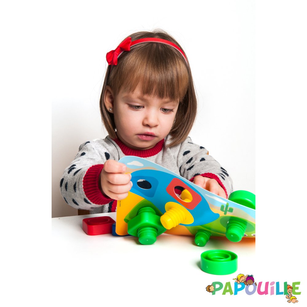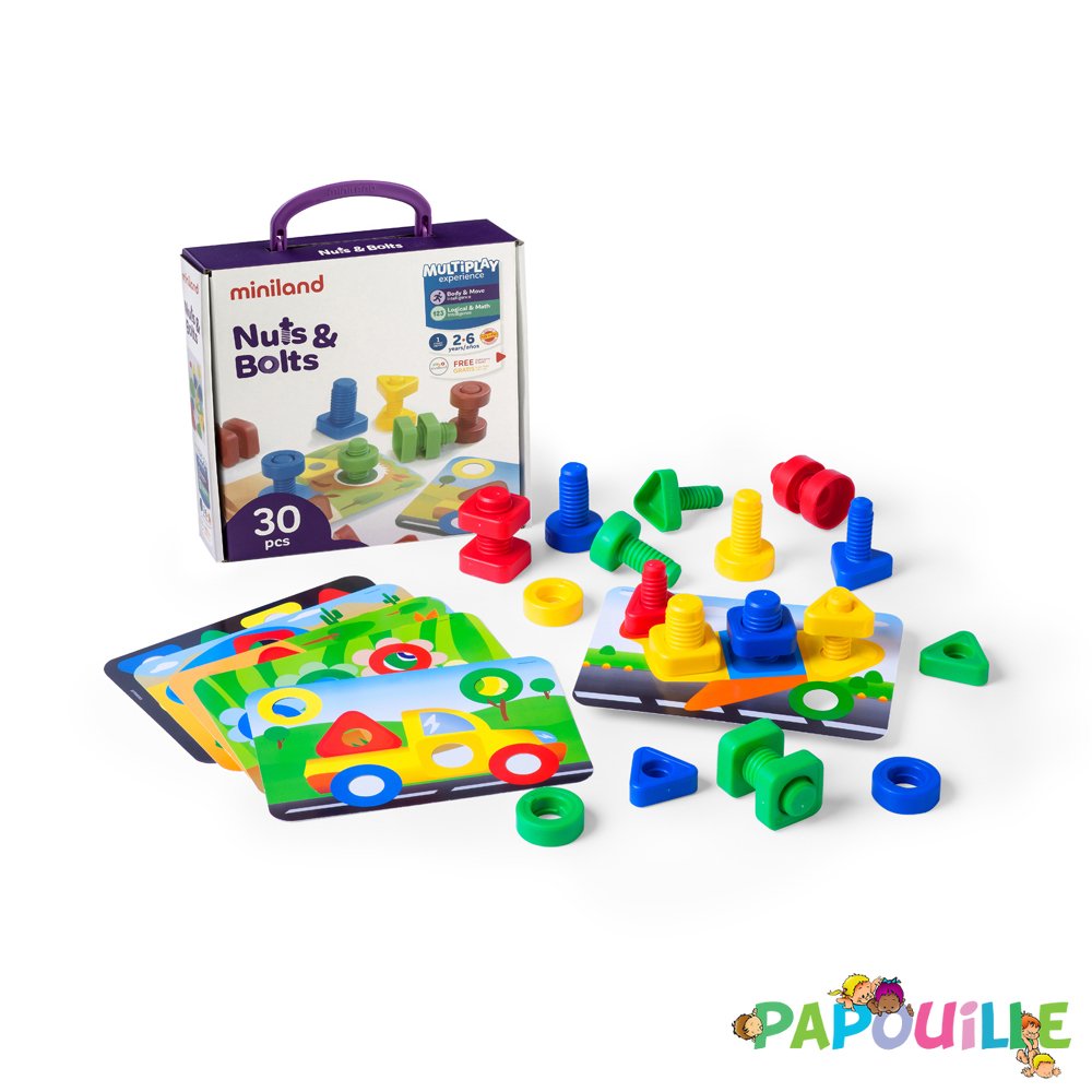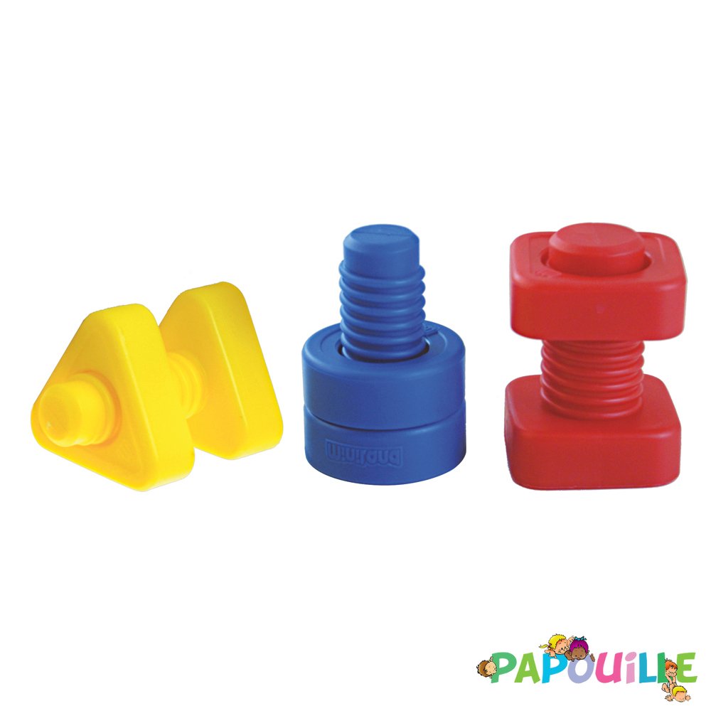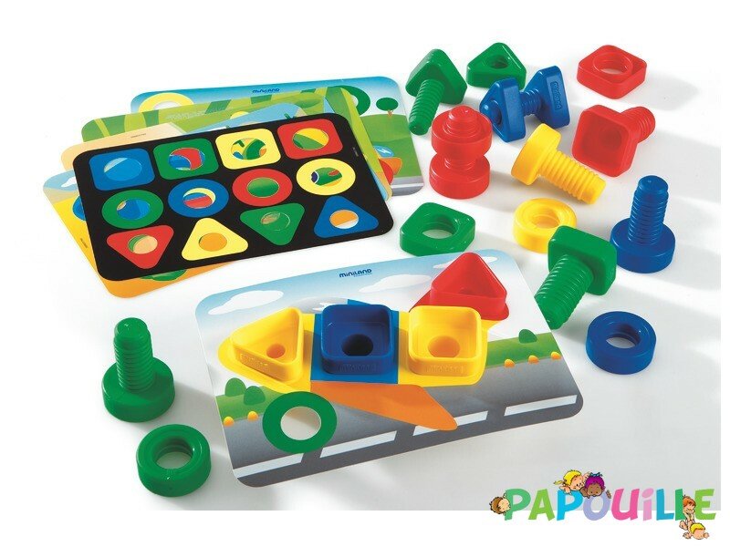 Les pièces se vissent et se dévissent pour travailler la motricité des poignets. La multitude de vis et d'écrous associée aux fiches d'activités permet de travailler la reconnaissance des formes et des couleurs ainsi que le développement du langage.