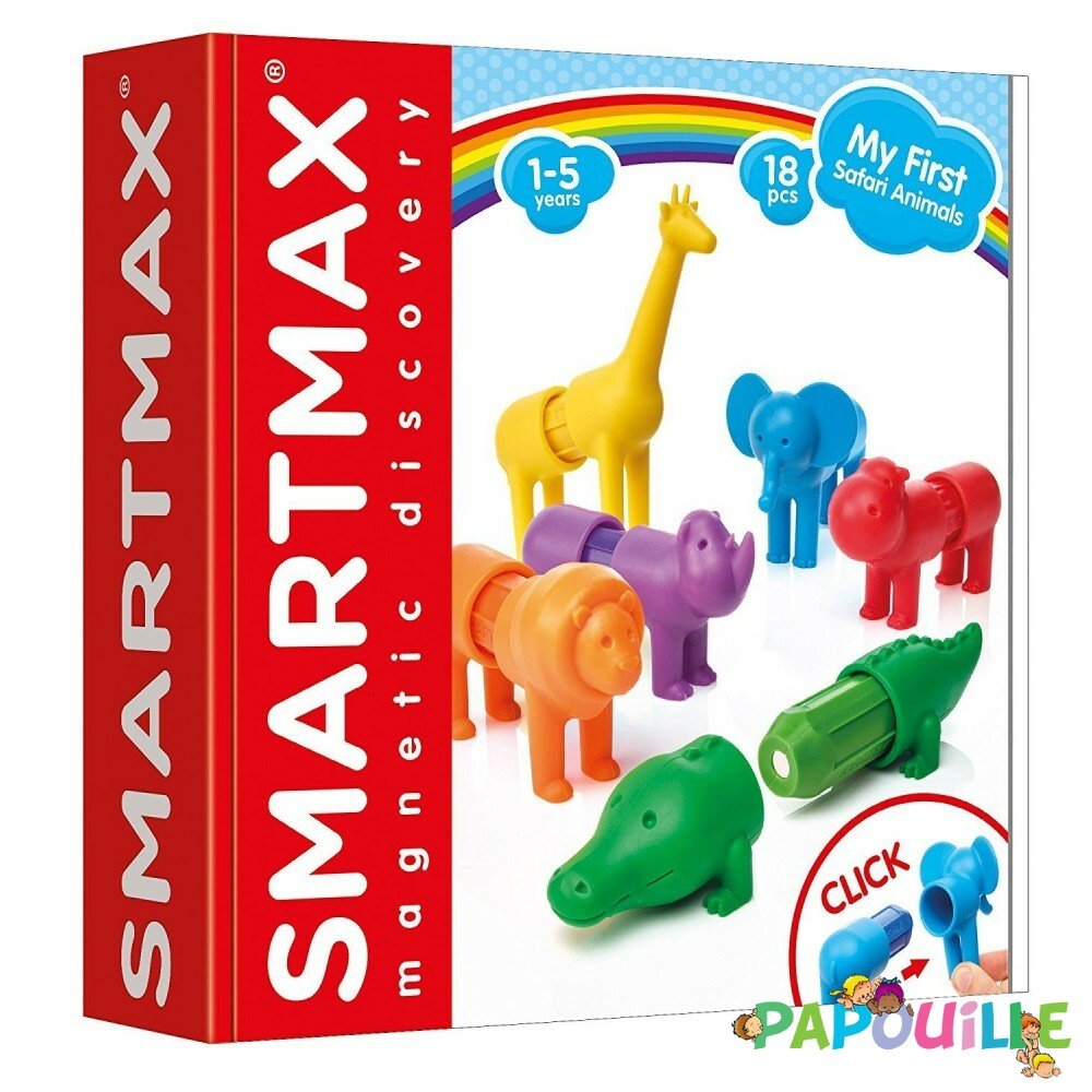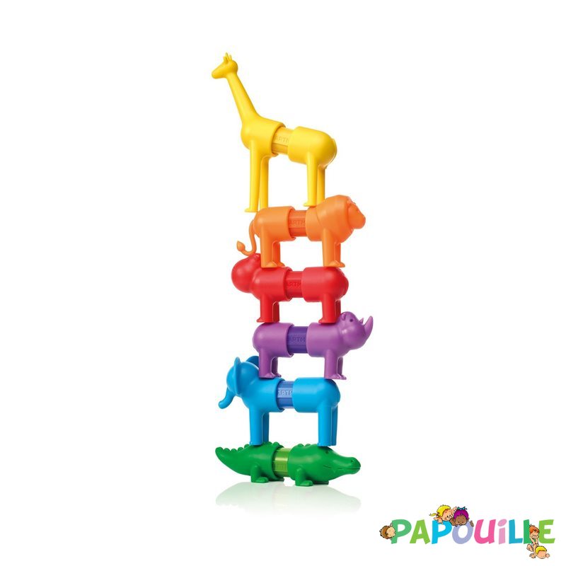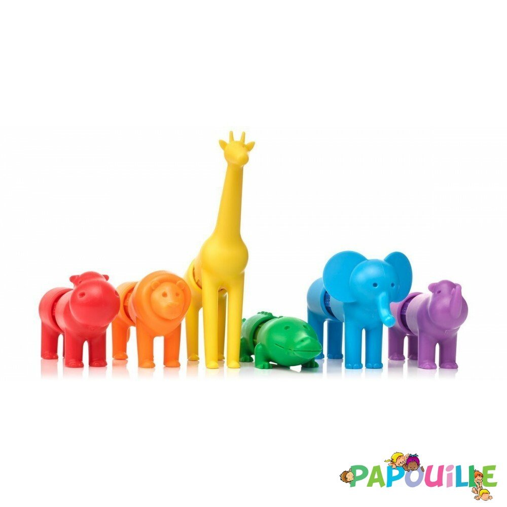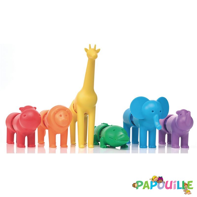 Contenu : 6 animaux (en 2 parties chacun) : girafe, hippopotame, lion, éléphant, crocodile et rhinocéros, 6 bâtonnets médium.