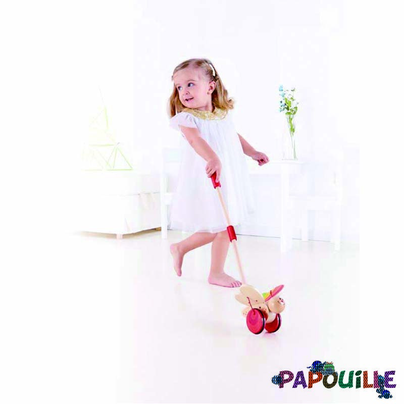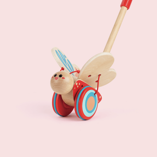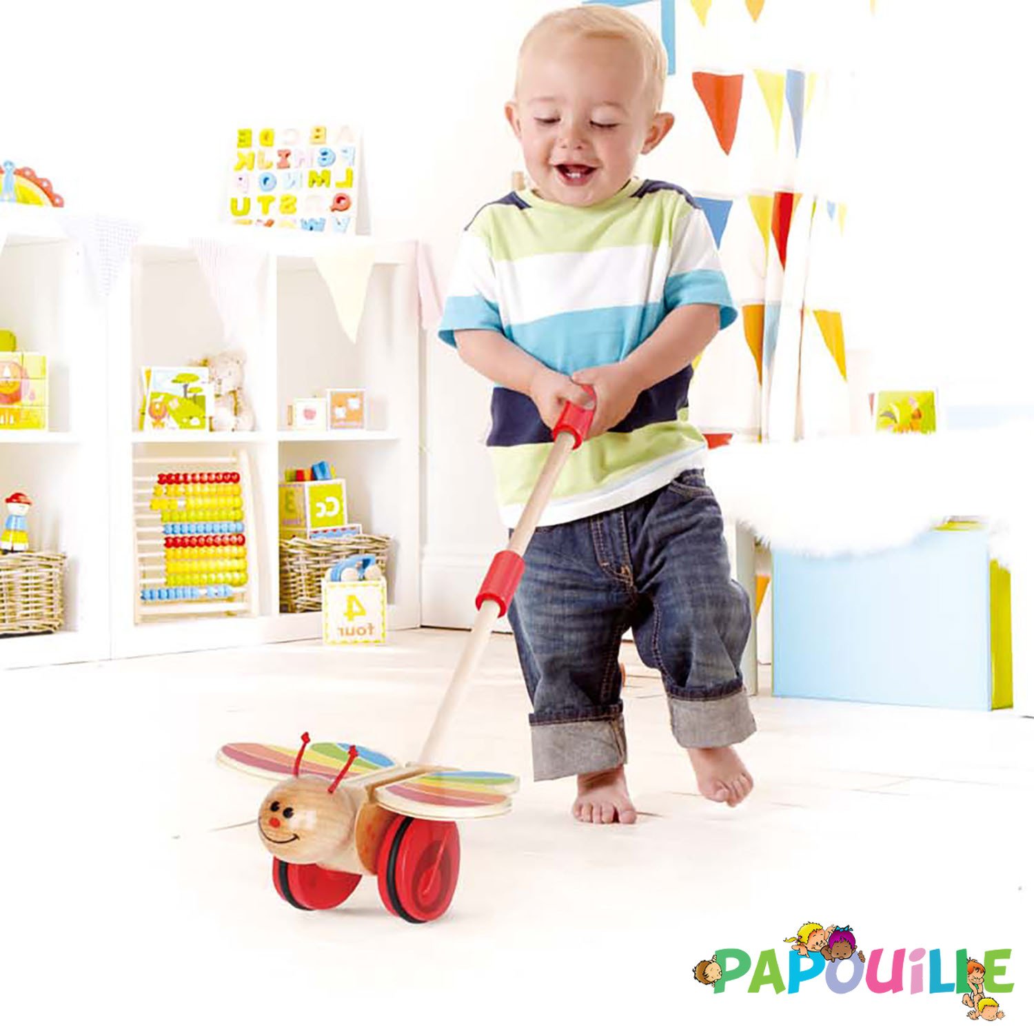 Dès les premiers pas, l’enfant est stimulé par le battement rythmé des ailes du papillon, activé simplement par une poussée ou une traction. Cette interaction renforce la coordination œil-main, la motricité globale et la notion de cause à effet, essentielles au développement psychomoteur.