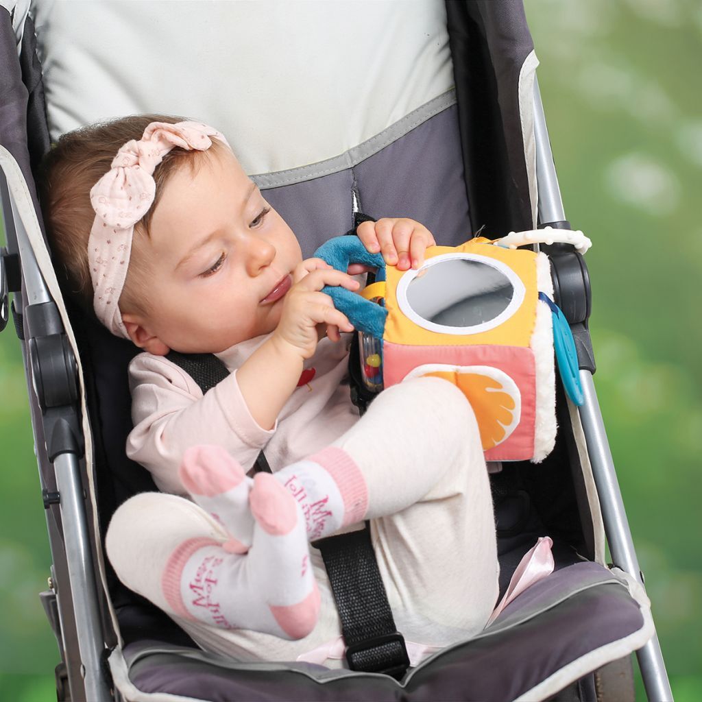 Sur les faces du cubes, bébé pourra s’admirer dans un petit miroir, caresser un joli tissu doux minky en vagues, gratter un tissu plissé, manipuler le papier bruissant de la feuille et découvrir le rigolo flamant rose.