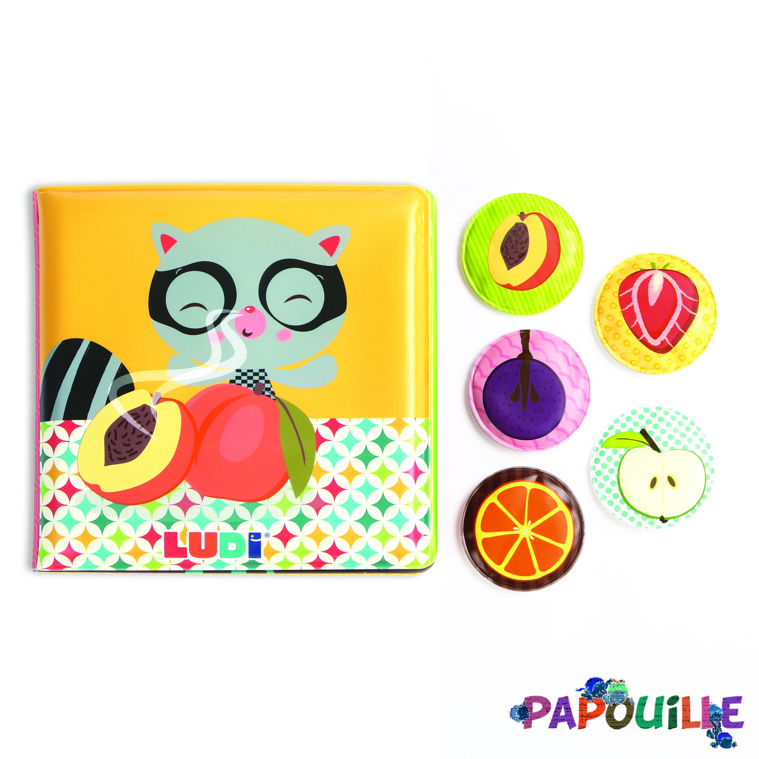 Cinq petites vignettes représentant la tranche des fruits accompagnent le livre.