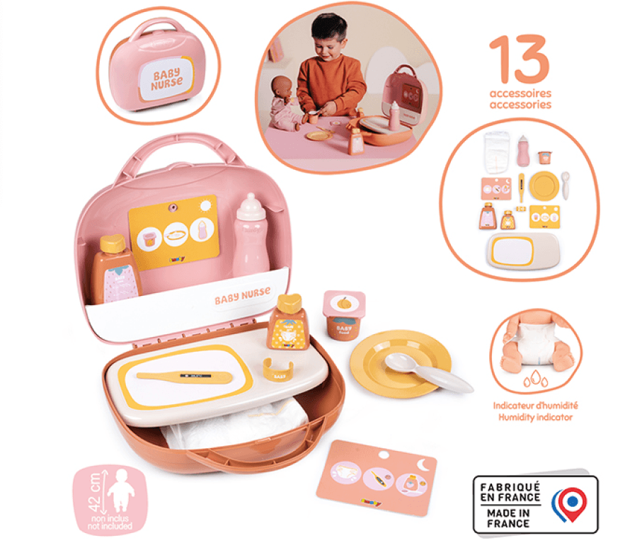 Ce jeu favorise également les apprentissages liés aux routines de soin et d’hygiène, ce qui en fait un excellent outil pédagogique pour les structures d’accueil comme les crèches, micro-crèches, EAJE ou même les écoles maternelles. Les 13 accessoires inclus stimulent les jeux de rôle en petit groupe ou en activité encadrée.