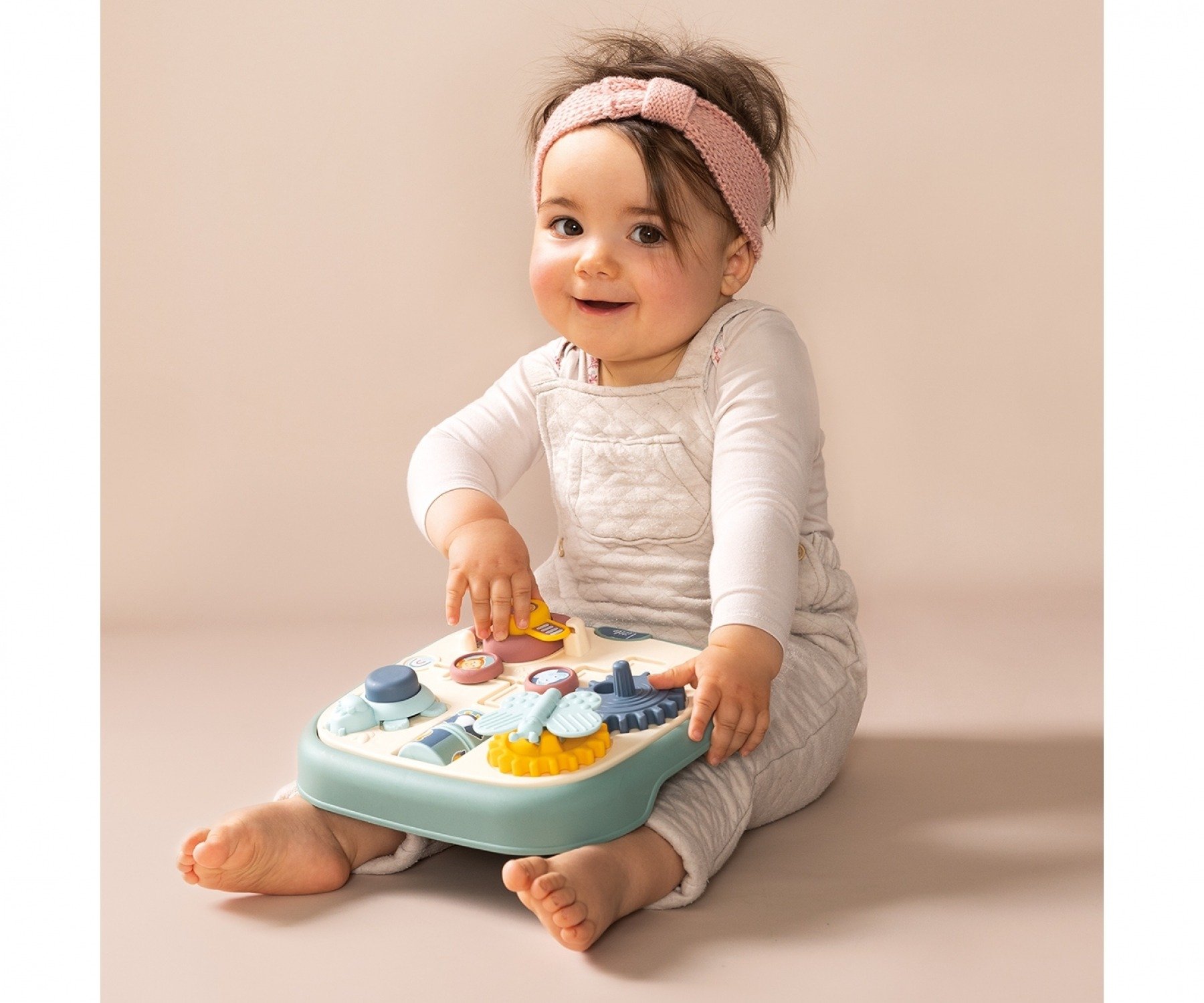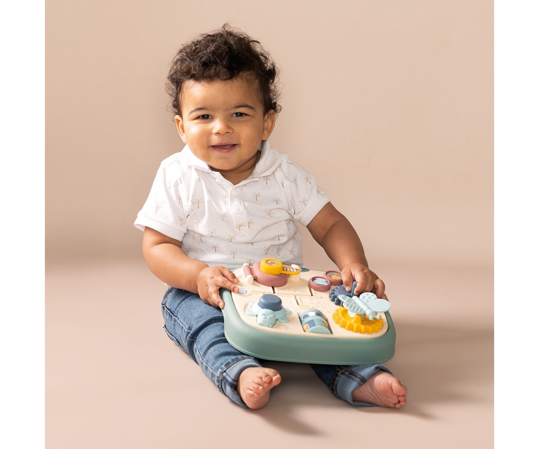 Les enfants peuvent explorer un labyrinthe graphique, manipuler une porte secrète à verrou, faire tourner les engrenages en forme de papillon qui animent ses ailes, actionner deux rouleaux pour créer des animaux rigolos, ou encore découvrir un hippopotame aux pattes mobiles en appuyant sur son ventre. Chaque élément a été pensé pour favoriser la motricité fine, la coordination œil-main, la curiosité et l’autonomie.