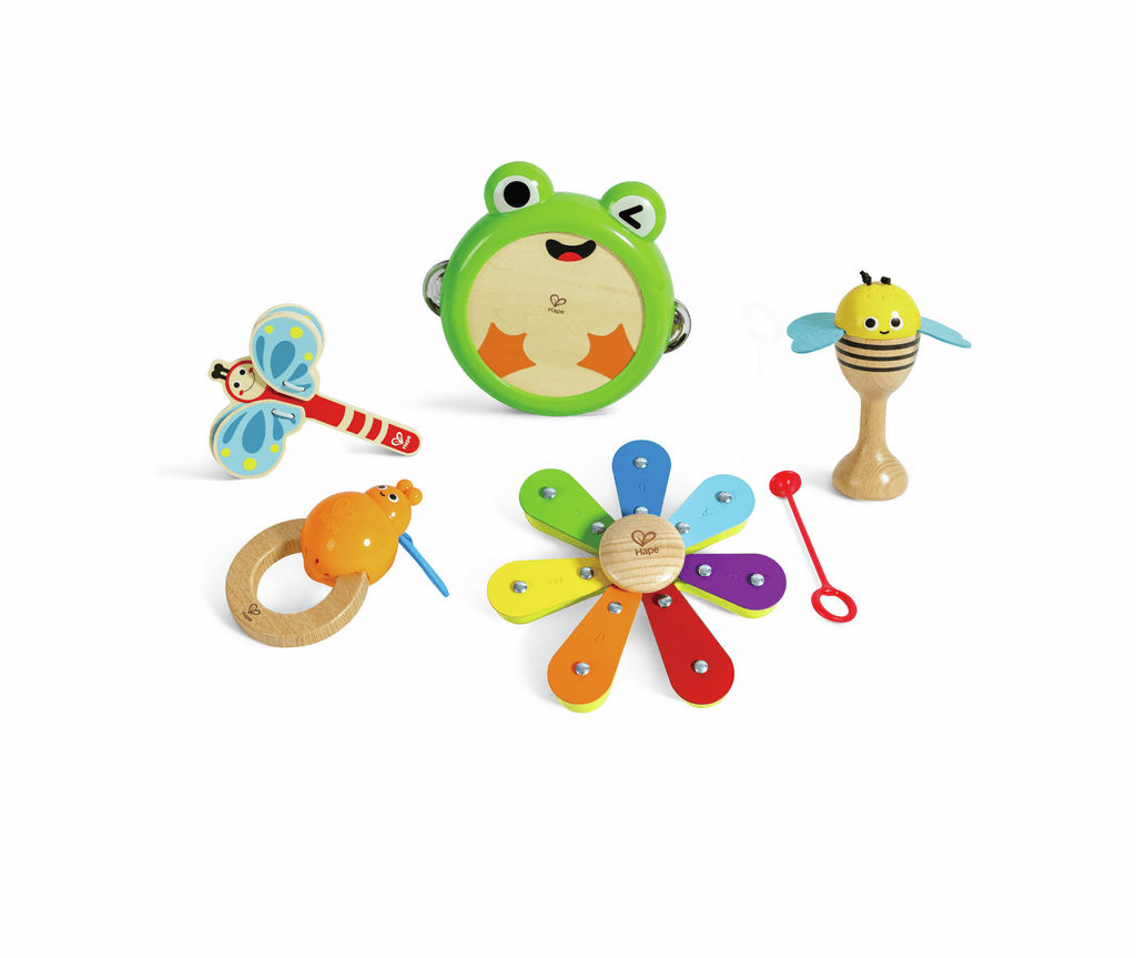 Avec cinq instruments thématiques – castagnettes papillon, maraca abeille, cloche libellule, xylophone à fleurs et tambourin grenouille – cet ensemble permet une découverte variée des sons et des rythmes. Les textures douces et les finitions colorées captivent les petits curieux, tandis que les sons produits développent leurs capacités auditives.