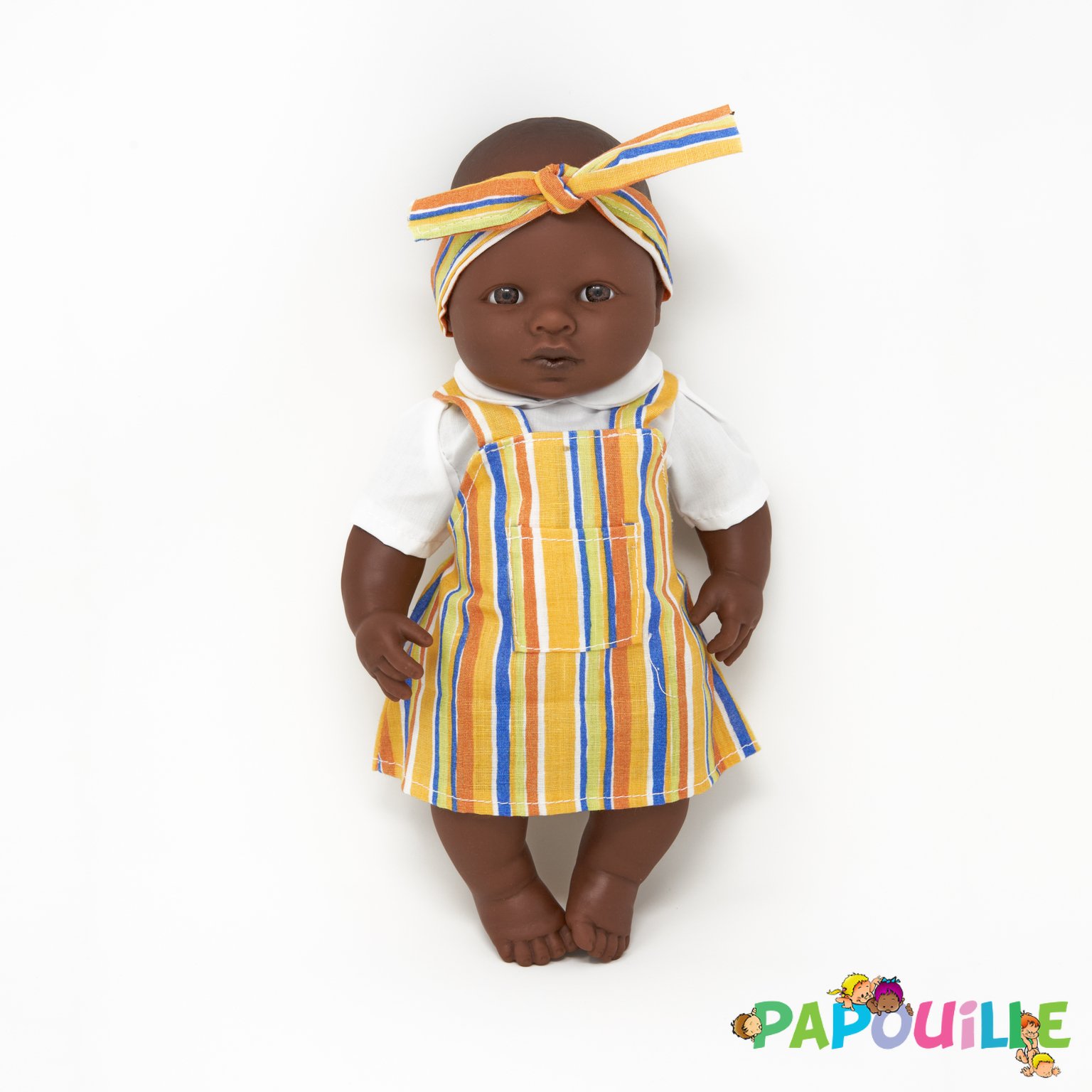 Poupée corps dur sans cheveux 30cm noir robe jaune