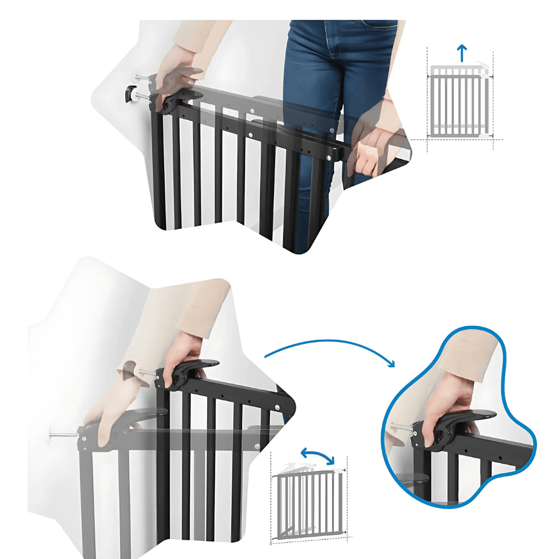 Son installation est simple et rapide : en moins de 10 minutes, elle est en place. Le système sans barre au sol évite les chutes et facilite le passage. Selon la fixation choisie, elle peut s’utiliser en portillon (fixation murale) ou en barrière amovible (fixation pression), avec une ouverture dans les deux sens et une poignée de sécurité, manipulable d’une seule main.