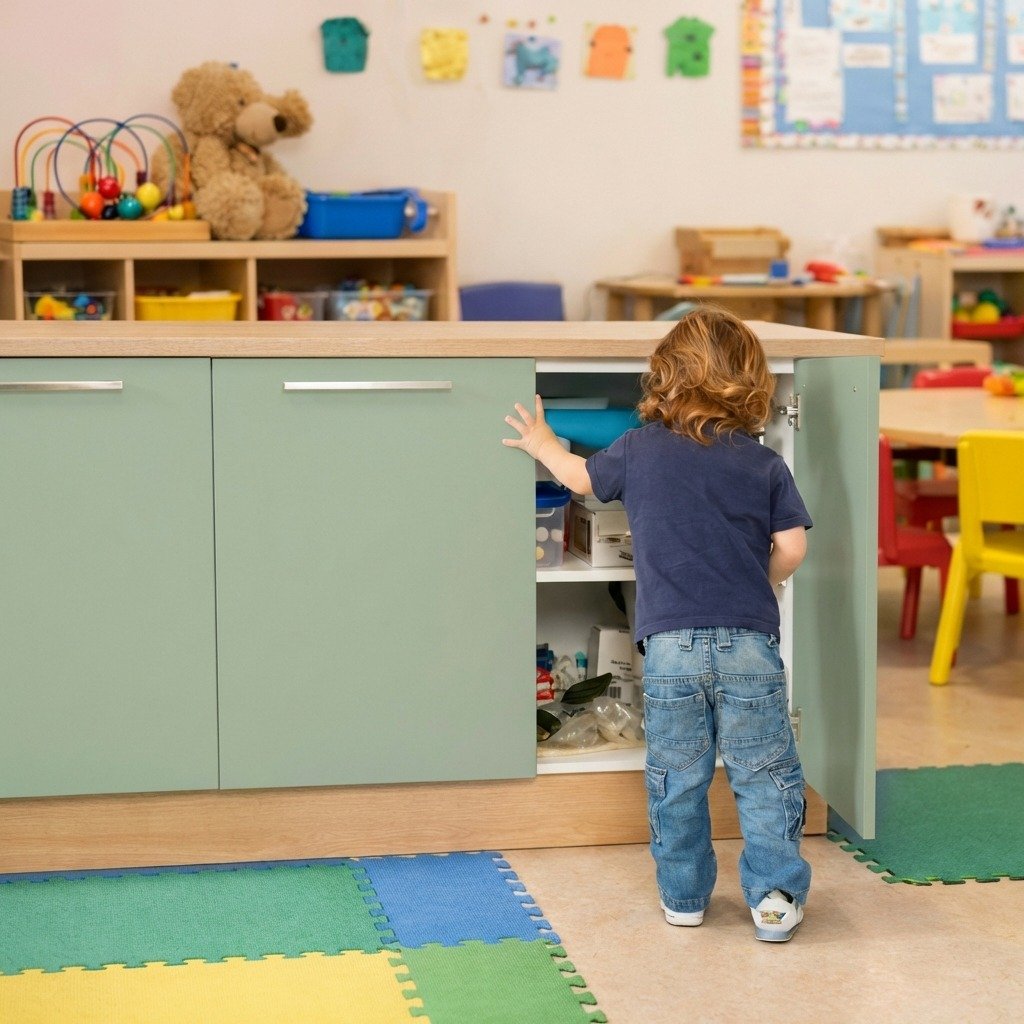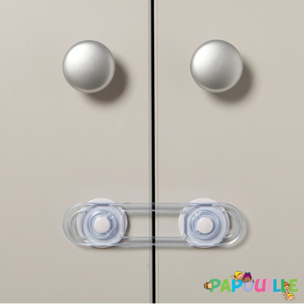 Le loquet multi surfaces de sécurité sera être le gardien de vos placards et rangement a risque en crèche ( EAJE ) ou à la maison,