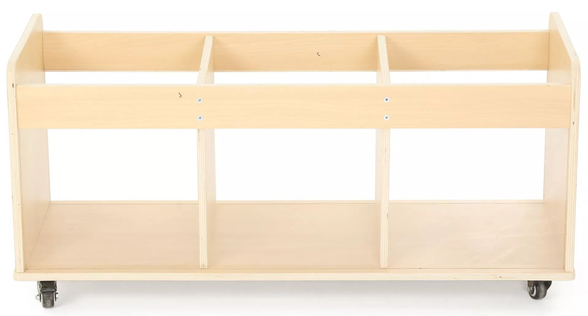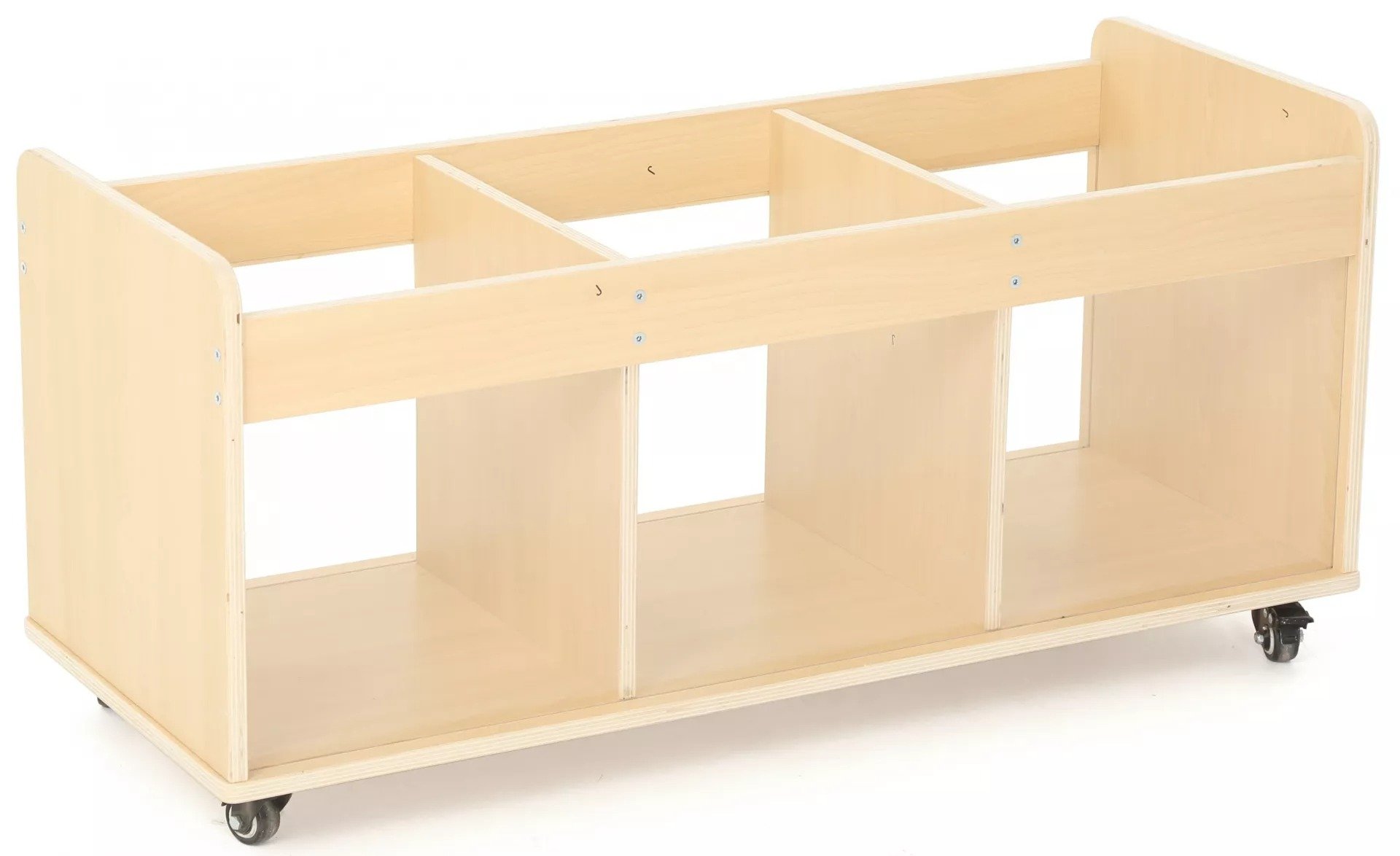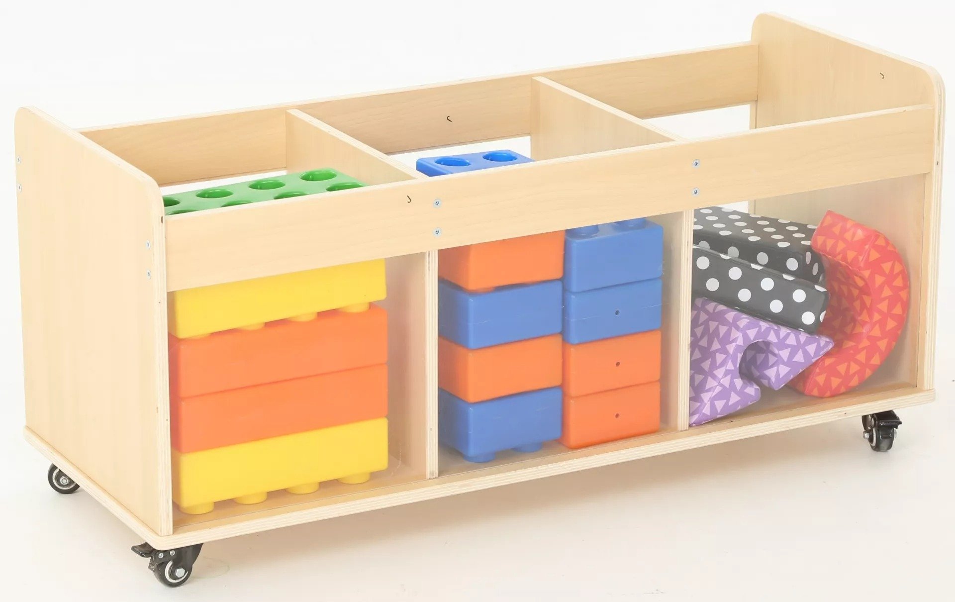 Avec ses trois grands compartiments, ce chariot offre une solution de rangement pratique et accessible pour une large gamme de matériaux de jeu, incluant les grands blocs de construction, les marionnettes, et bien d'autres