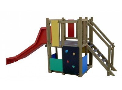 Une maison en bois parfaite pour inciter les enfants à se dépenser dans les écoles ou parcs. Les couleurs rendent l'aire de jeux encore plus attirante et amusante.
