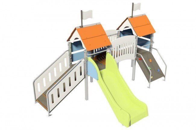- Il contient: 2 tours, 1 escalier, 1 toboggan en polyester, 1 passerelle et 1 mur à grimper.