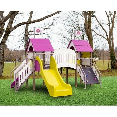 - Il contient: 2 tours, 1 escalier, 1 toboggan en polyester, 1 passerelle et 1 mur à grimper.
