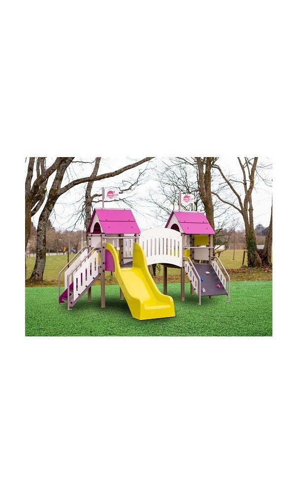 - Il contient : 2 tours, 1 escalier, 1 toboggan en polyester, 1 passerelle et 1 mur à grimper.
