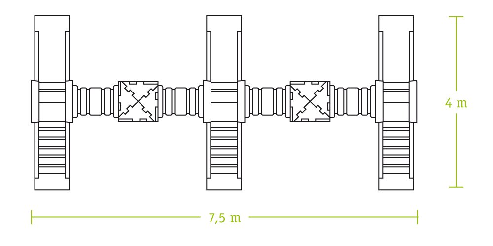 Cette structure est un véritable paradis de jeu avec ses trois toboggans colorés qui garantissent une descente amusante et sécurisée. L'ensemble comprend trois modules distincts avec des toboggans, offrant une variété de sensations de glisse. Chaque module est relié par des passerelles et des tunnels en forme de cylindres, favorisant la motricité et l'audace des petits aventuriers.