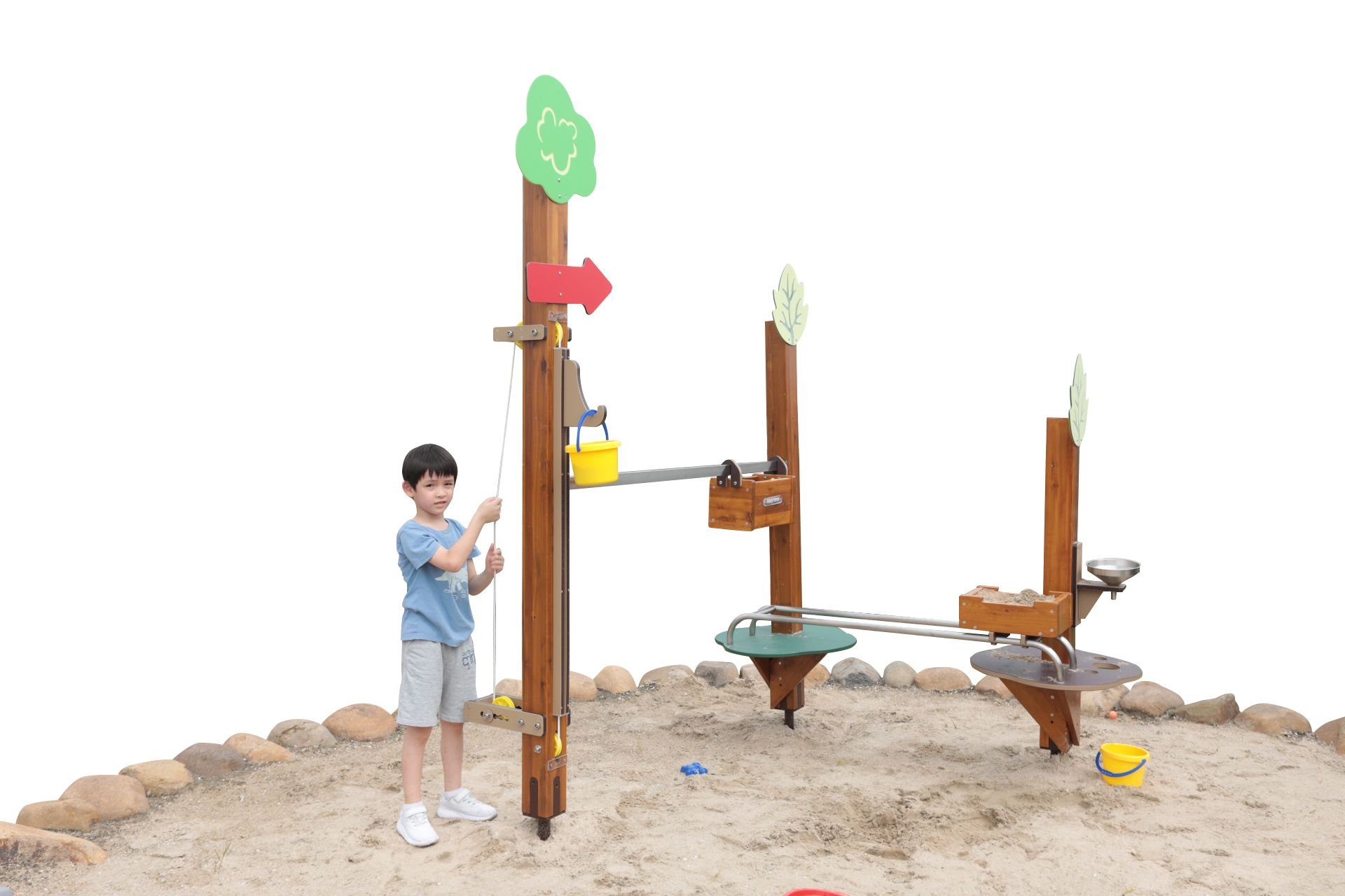 Offrez aux enfants une expérience immersive et ludique avec l’aire de jeux sable, un espace de construction dynamique qui stimule l'imagination et la motricité. Grâce à son ingénieux système de poulie, les petits bâtisseurs peuvent transporter, soulever et déverser le sable comme sur un véritable chantier. Le sable est convoyé vers le haut, puis versé dans un transporteur qui file directement vers la zone de déchargement, où un camion attend pour l’acheminer vers la station de mélange. Un entonnoir permet ensuite de le reverser dans le seau, créant ainsi un cycle de jeu interactif et captivant.