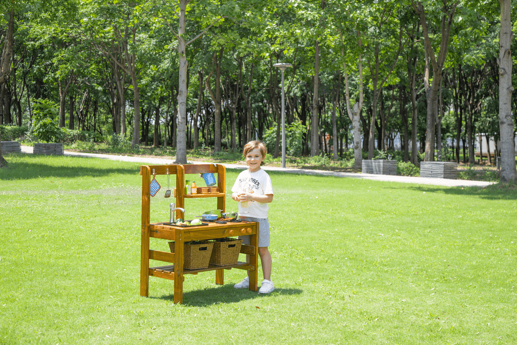 Cette cuisine d’extérieur stimule l’imaginaire des enfants tout en renforçant leur socialisation : partager les ustensiles, imaginer des recettes, ou encore jouer à tour de rôle développe des compétences essentielles dès le plus jeune âge. L’utilisation de matériaux résistants comme le bois traité en autoclave et l’acier inoxydable garantit une excellente tenue aux intempéries, parfaitement adaptée aux cours de crèches et jardins d’écoles maternelles. Sa hauteur ergonomique de 55 cm est idéale pour les tout-petits, permettant une manipulation libre en toute autonomie et une interaction naturelle avec l’environnement.