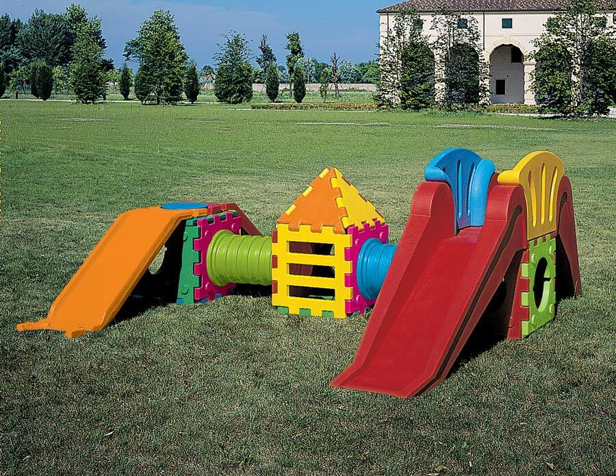 Cette aire de jeux en plastique 100% recyclé comporte 14 côtés de cube, 2 côtés d' échelle, 2 tunnels,1 grand toboggan, 1 grand escalier, 2 côtés de protection, 4 triangles, 2 toboggans, ainsi qu'une partie supérieure.