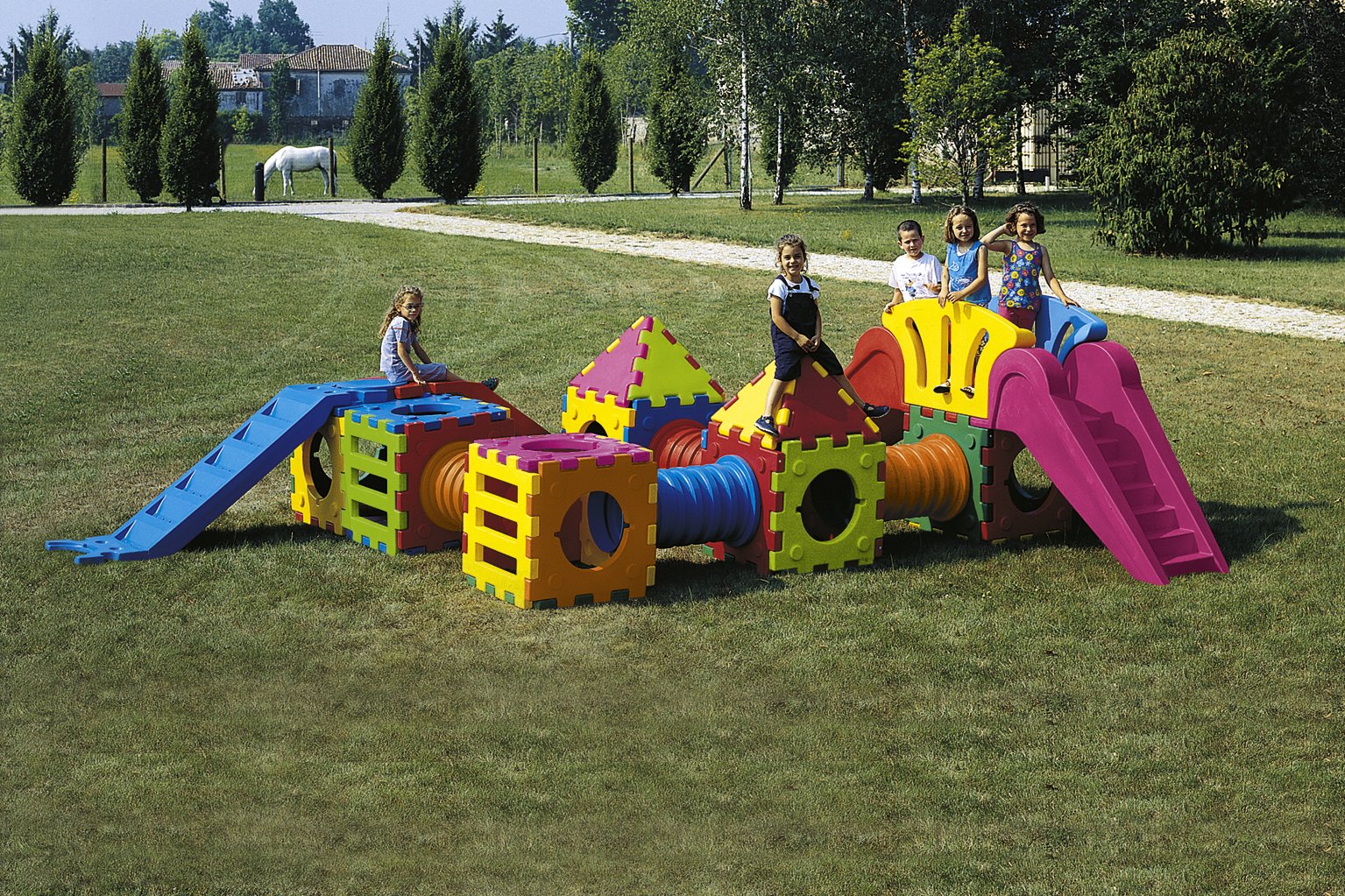 Avec ce parcours de jeux cubique, transformez n'importe quel espace extérieur en un terrain de jeu stimulant où l'imagination des enfants prendra son envol. Le toboggan invite à la glisse et au plaisir, tandis que les ouvertures et fenêtres des cubes favorisent les jeux de cache-cache et encouragent la socialisation et le jeu en groupe.