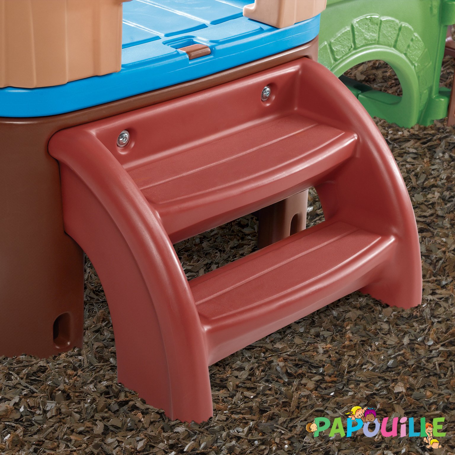 La plateforme de jeu complète est ultra-résistante et durable (3 ans de garantie, en plastique polyéthylène roto-moulé à double parois, fabriqué aux USA).