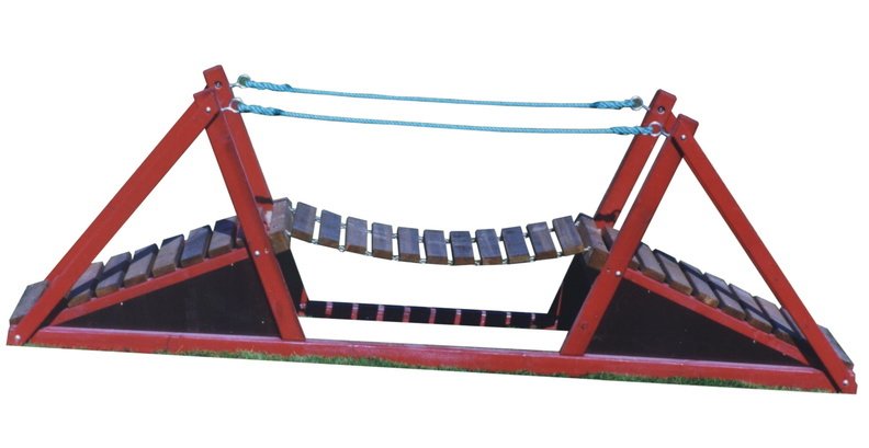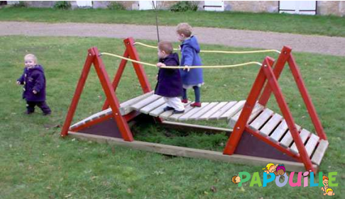 Avec le pont suspendu pour aire de jeux la hauteur apprend aux enfants à gérer leur peur du vide, puis de prendre confiance en eux une fois le parcours terminé.