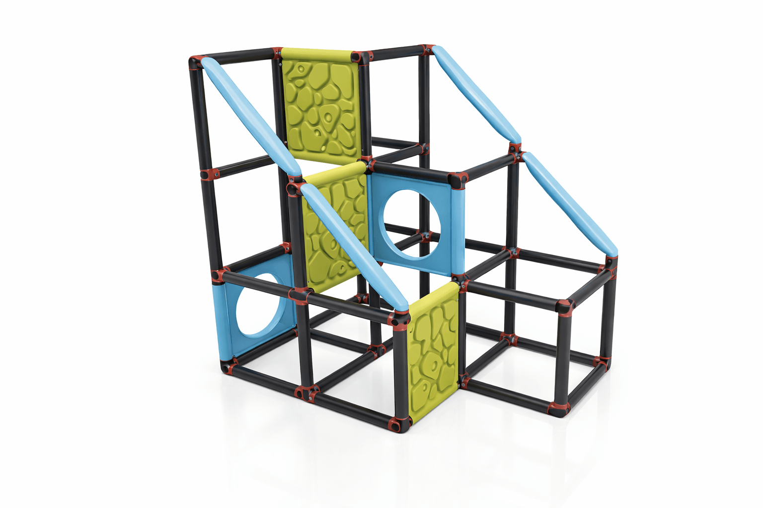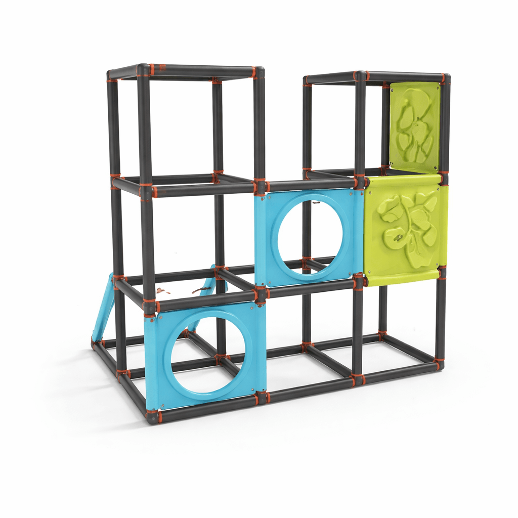 Véritable support de motricité libre, cette structure favorise le développement de l’équilibre, la coordination œil-main et la conscience corporelle. Les jeunes enfants expérimentent les hauteurs, testent leurs appuis et renforcent leur confiance en eux à travers le jeu actif. Les panneaux intégrés stimulent également l’éveil sensoriel et encouragent la manipulation, dans une approche inspirée des pédagogies actives comme Montessori ou Pikler.