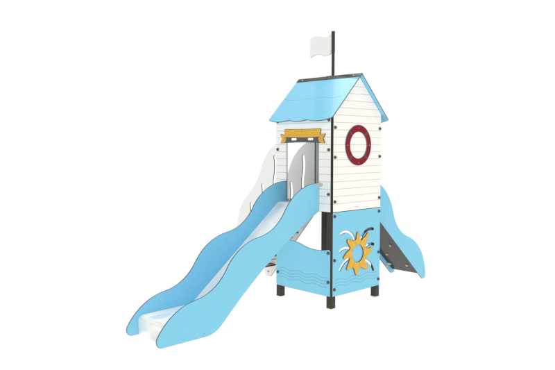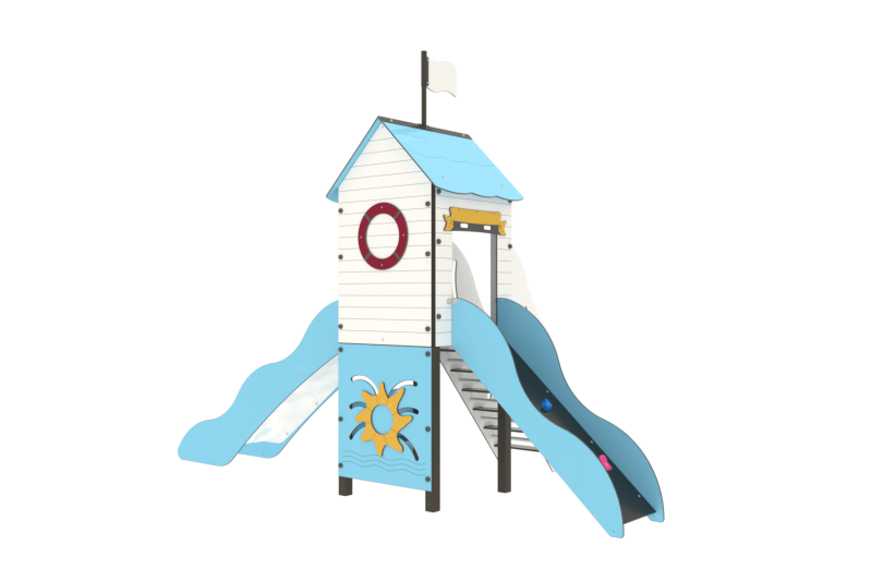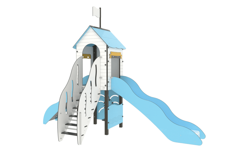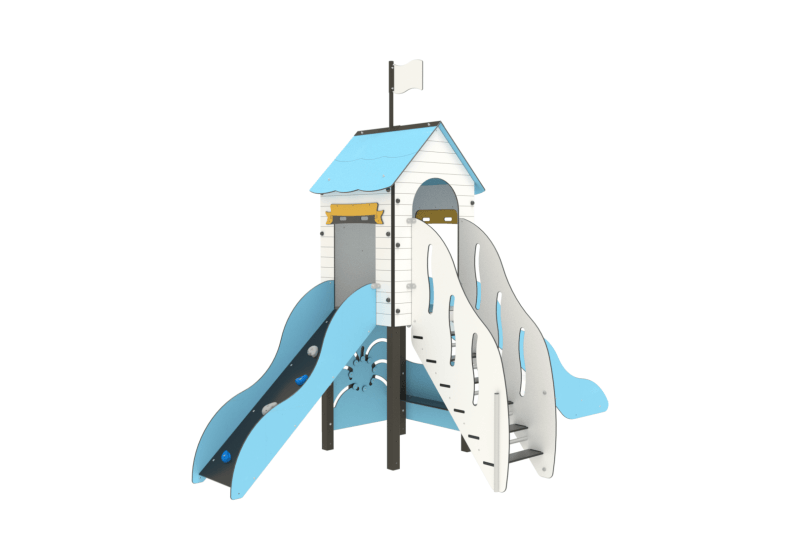 Composition : 1 toit, 1 escalier, 1 glissière, 1 mur à grimper, 1 assise, 1 panneau ludique