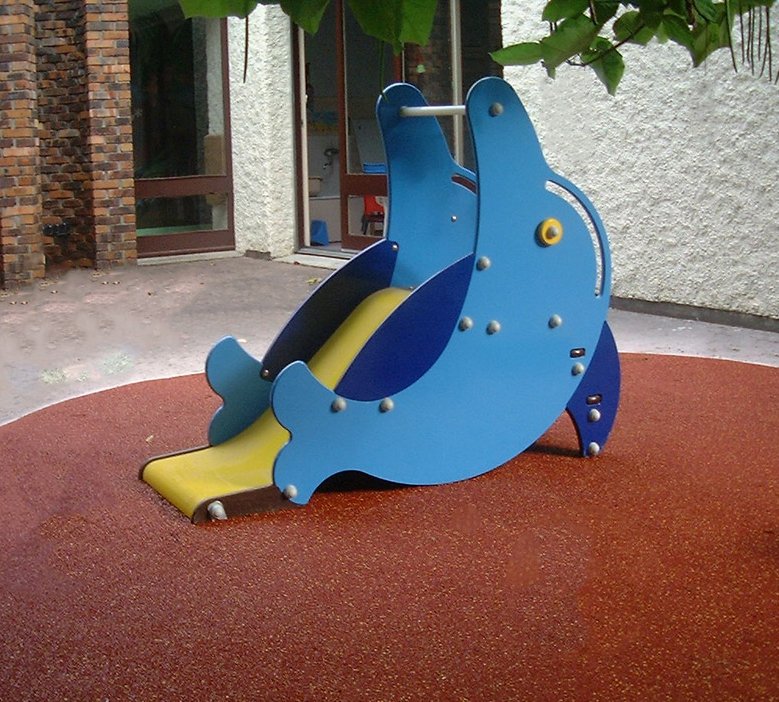 Un petit toboggan à l'effigie d'un dauphin pour que les tout-petits puissent faire des glissades en toute sécurité.