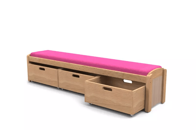 Les 3 bacs à roulettes offrent un espace de rangement pratique, c'est un excellent moyen pour optimiser l'espace. Ce banc est simple et polyvalent, il peut être utilisé pour s'asseoir pendant les activités ou pour stocker et ranger des objets tels que des jouets, des livres ou des fournitures scolaires.