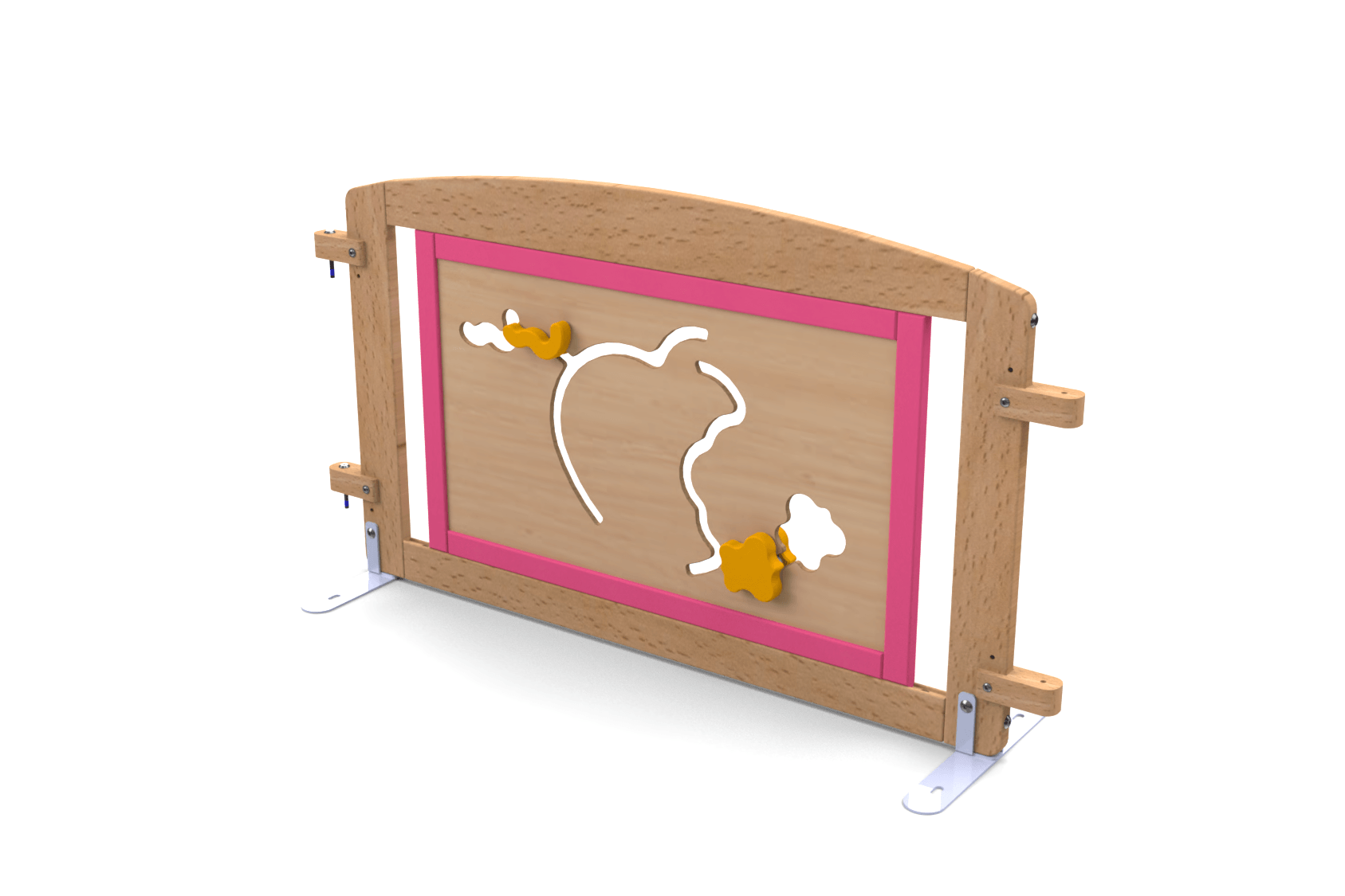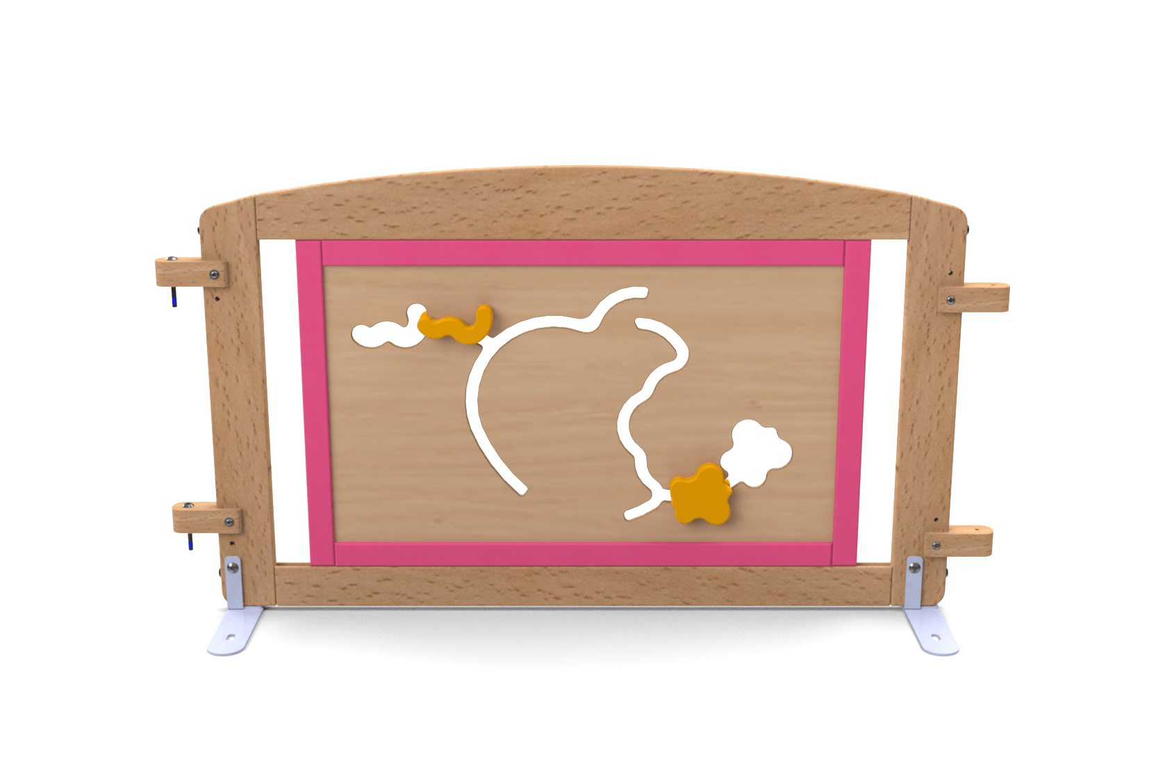 Elle comprend sur le panneau principal 2 sujets à déplacer dans les rainures du logo en forme de pomme.