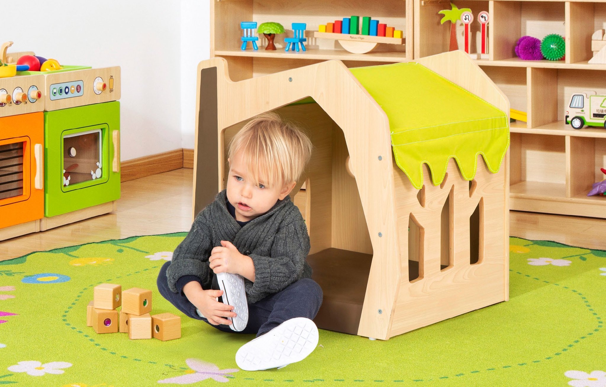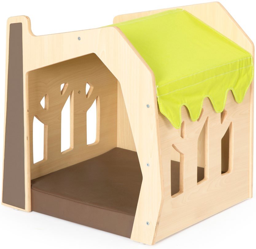 Parfait pour les crèches, micro-crèches, EAJE et autres structures d’accueil, ce cottage est fabriqué en peuplier multiplex avec revêtement mélaminé aspect érable, un matériau à la fois résistant et esthétique. L’ajout de mousse et de PVC assure un maximum de confort et de sécurité aux jeunes aventuriers.