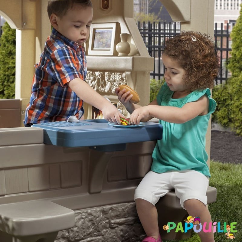 Avec un design ouvert, une sonnette électronique pour savoir quand leurs amis sont arrivés pour le fun et une assise confortable au "coin feu" avec des jardinières intégrées, cette maison de jeu est parfaite pour le jeu de rôle imaginatif.