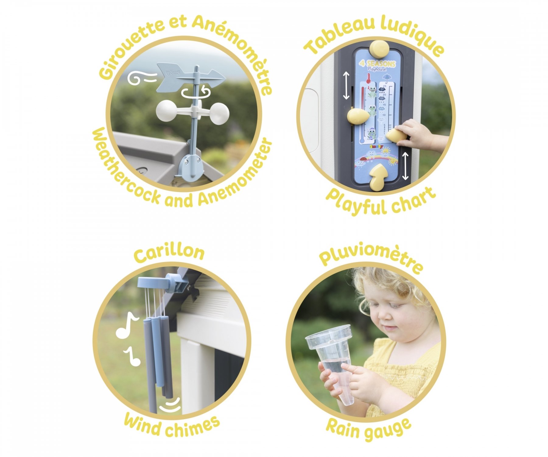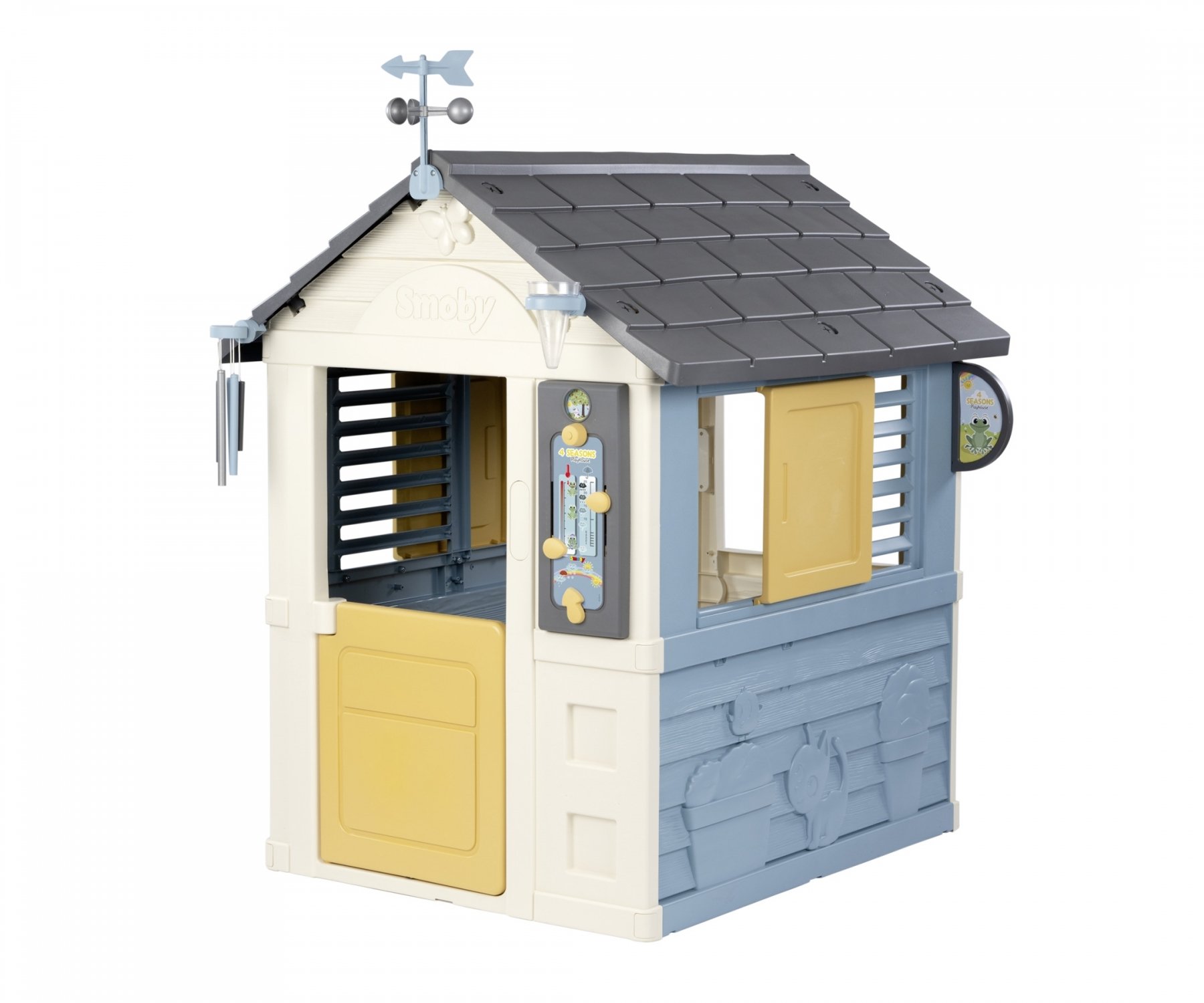 Équipée d’une girouette/anémomètre, d’un pluviomètre et d’un tableau ludique, la maison permet aux enfants d’observer et de comprendre la météo. Ils peuvent mesurer la vitesse et la direction du vent, évaluer la quantité de pluie, puis retranscrire leurs observations sur le tableau interactif grâce à des curseurs indiquant les saisons, la température et la météo du jour. Une approche ludique et concrète pour les sensibiliser aux sciences naturelles dès le plus jeune âge !