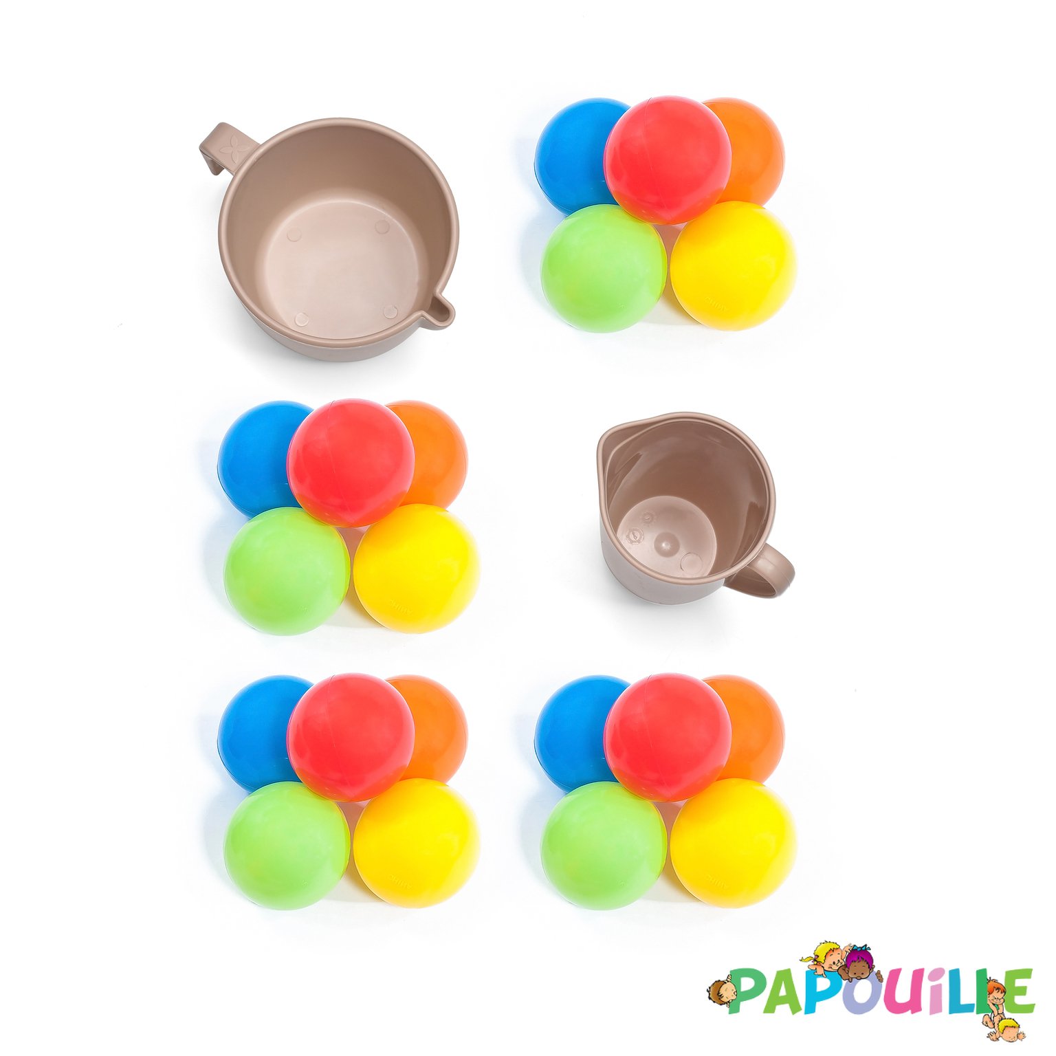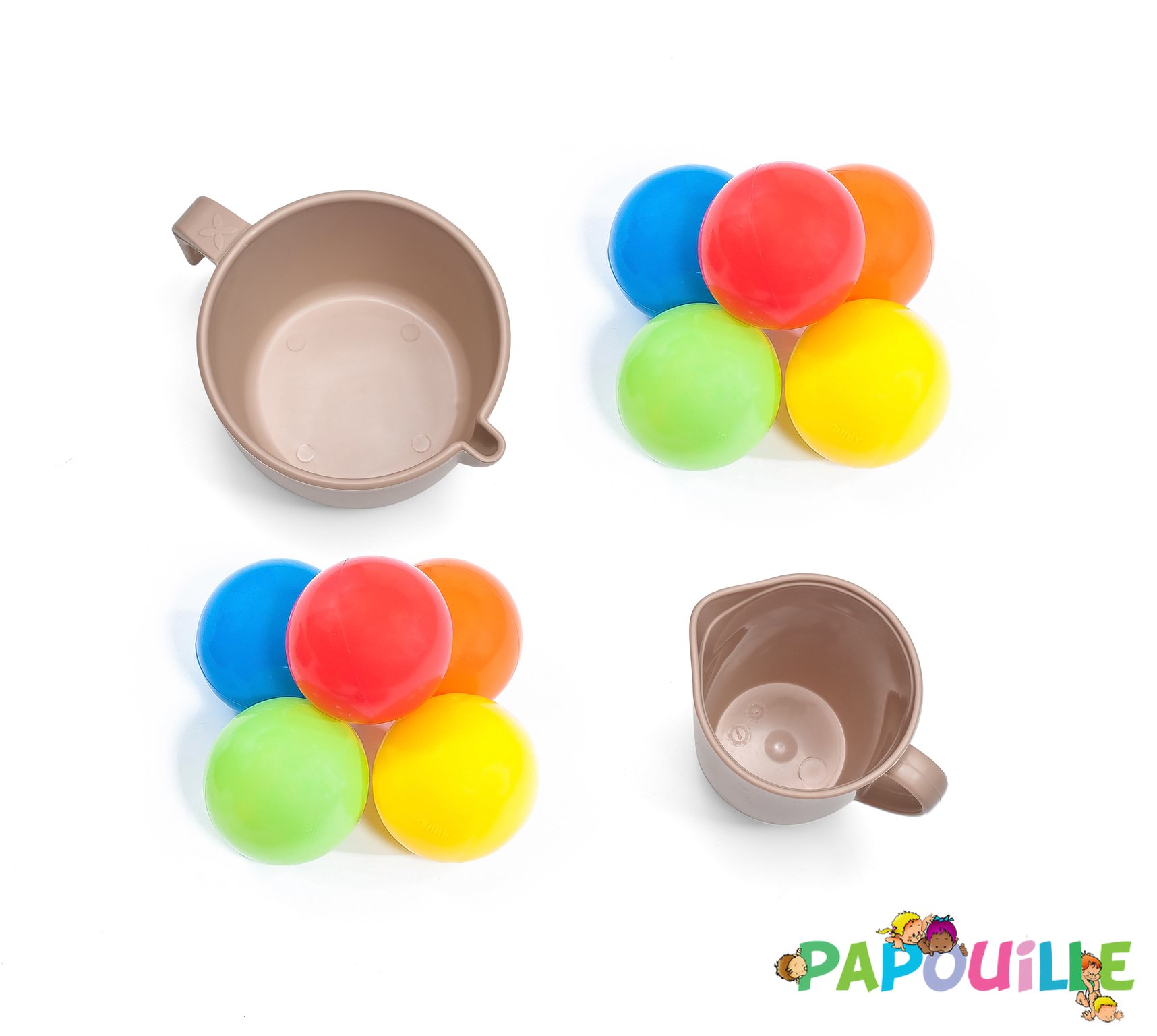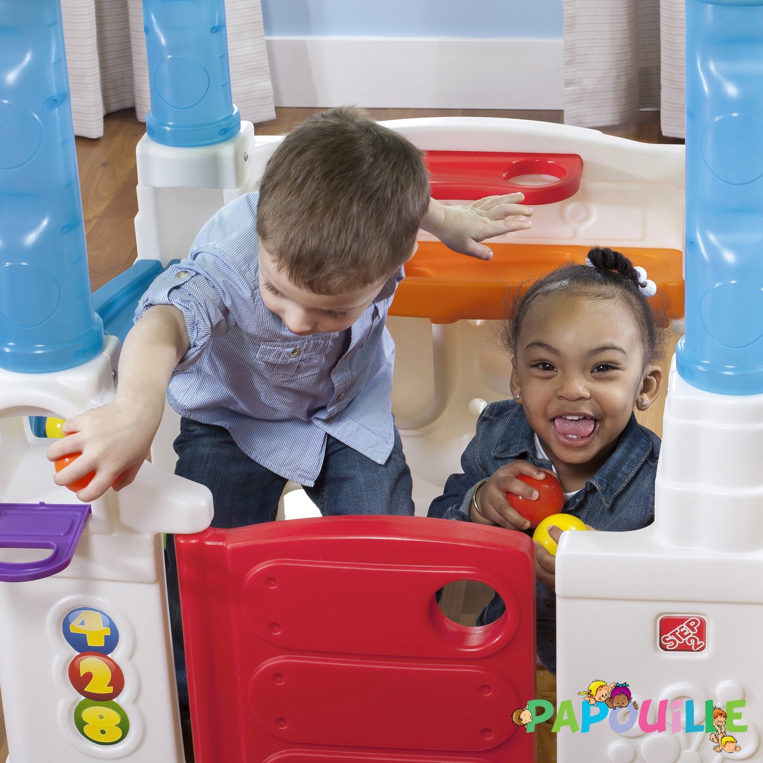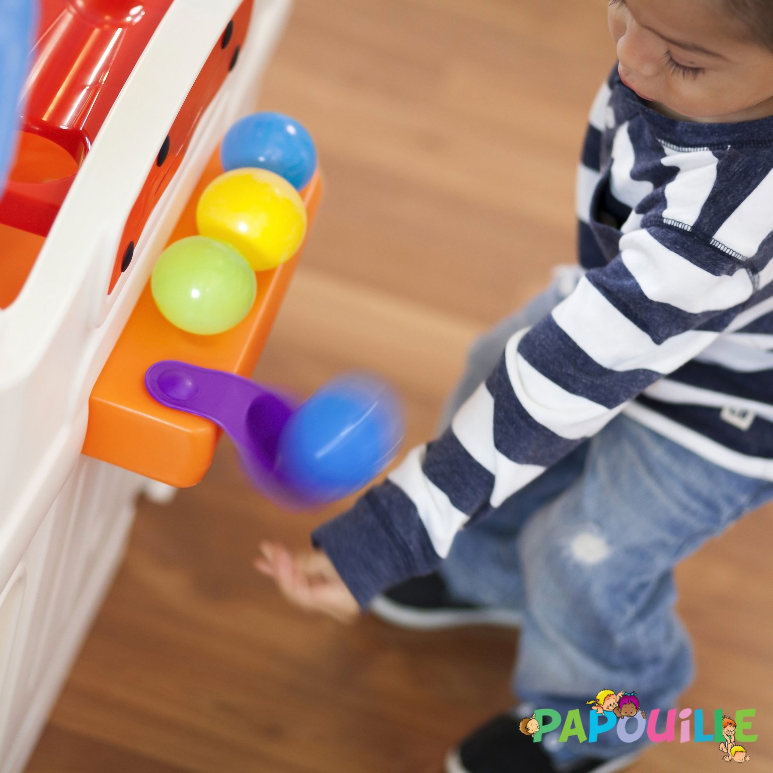 Les tout-petits renforceront leur coordination et leur motricité fine et visuelle, quand ils jettent les balles colorées sur le toit et les regardent tomber dans le dédale des activités en faisant des sons amusants.