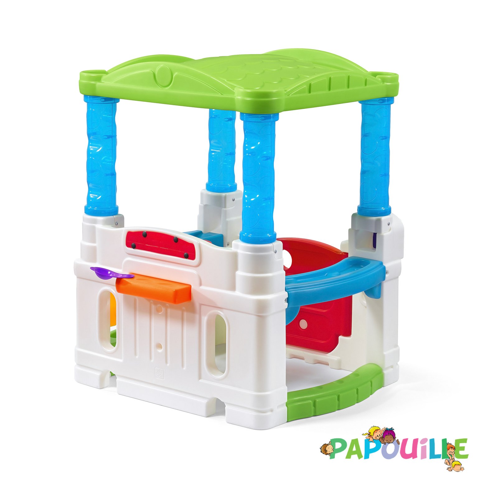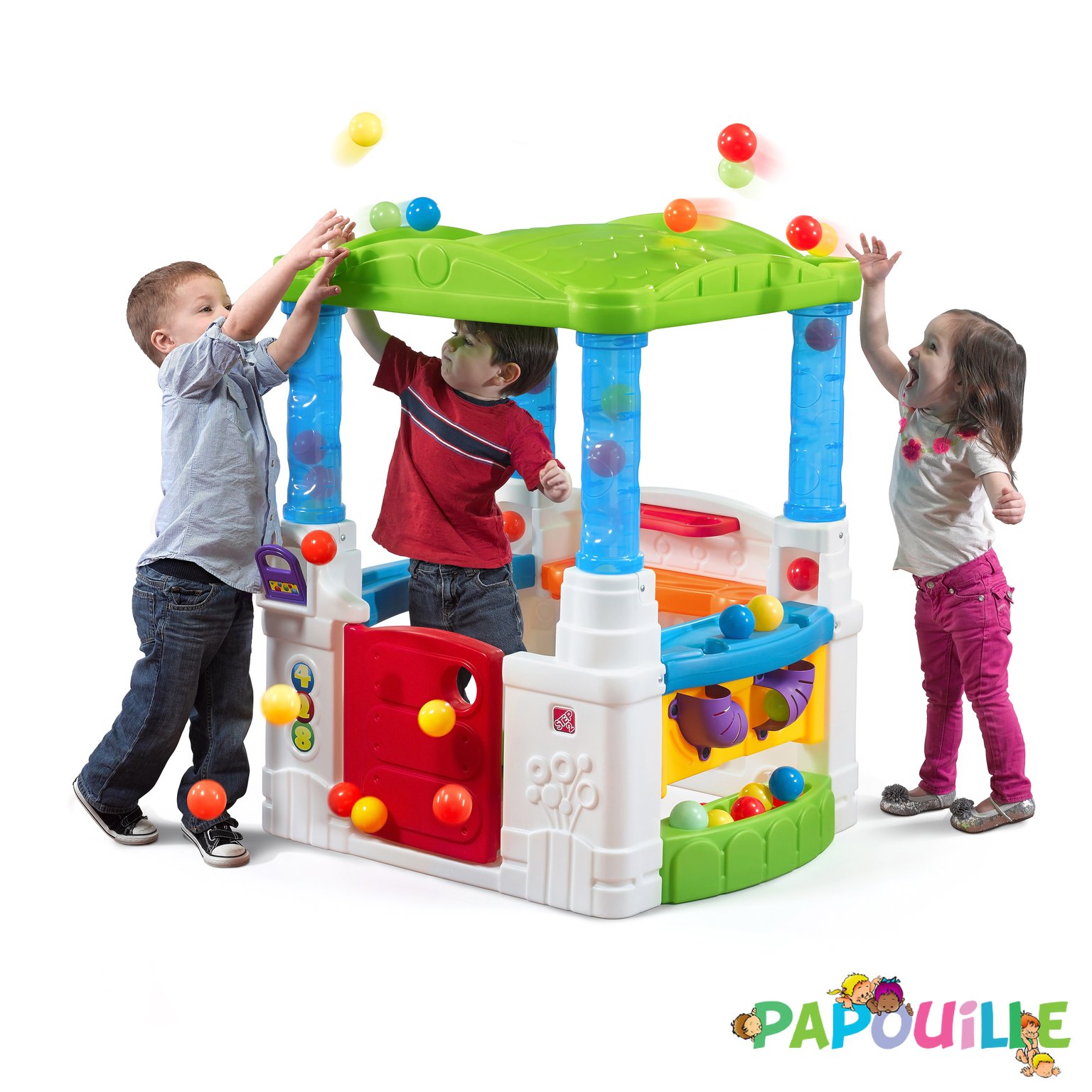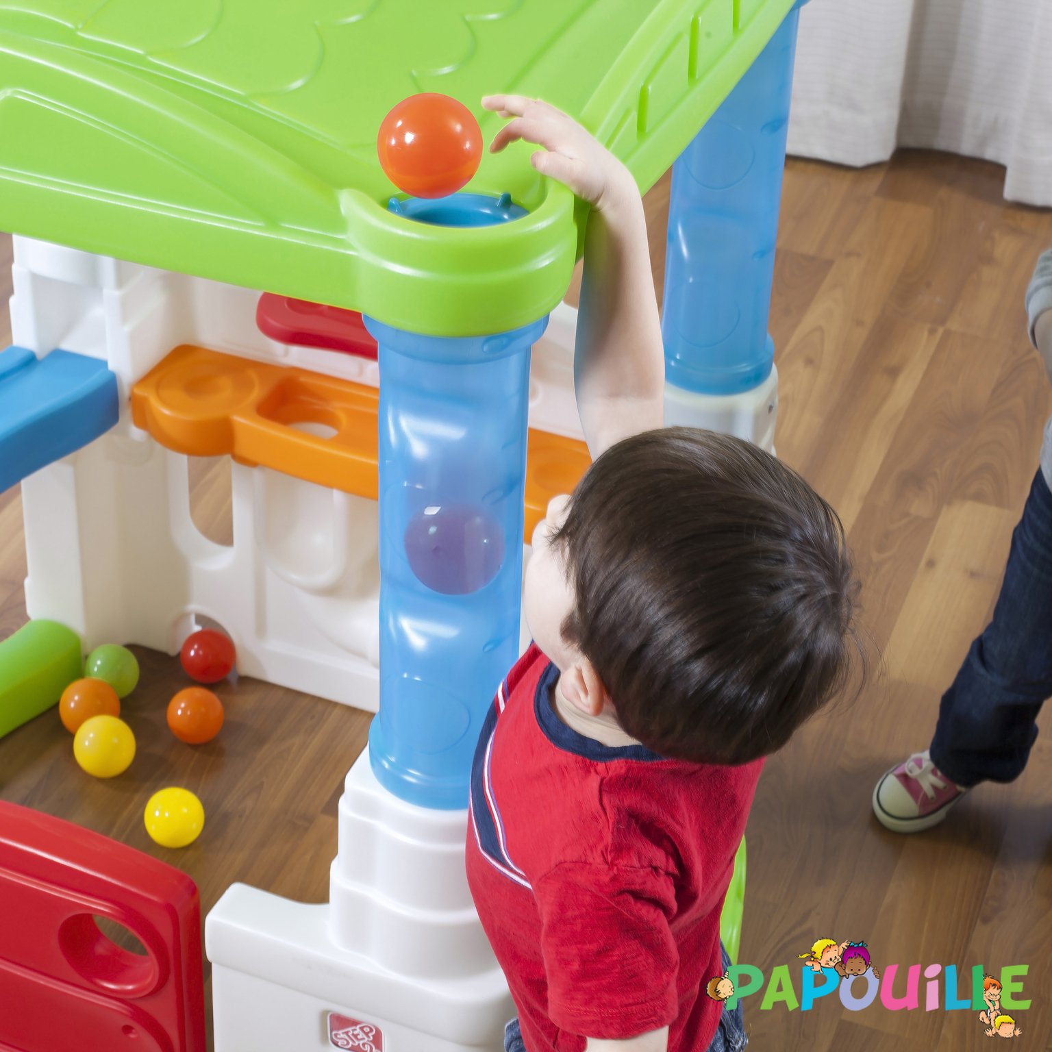 A l'intérieur de la maison, les balles dévalent aussi les parcours aménagés. Catapulte à balles intégrées. La porte s’ouvre et laisse passer une balle Bac intégré pour stocker les balles fois la récréation terminée.