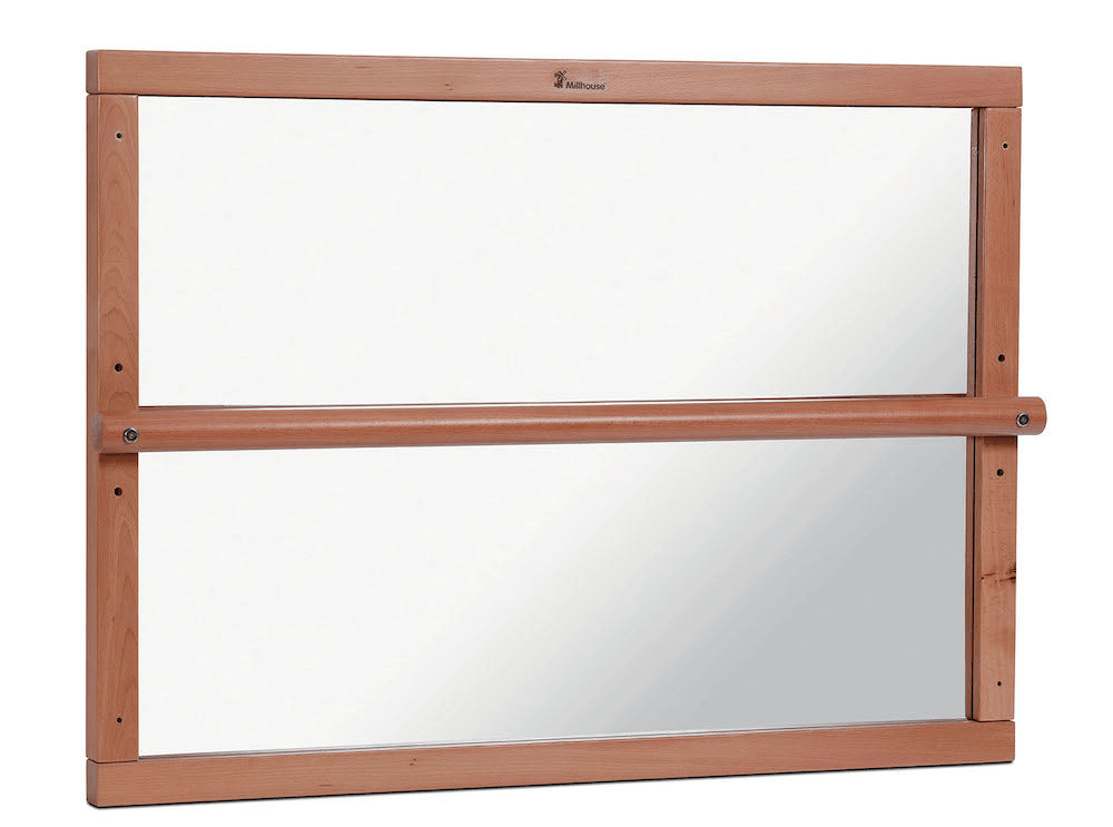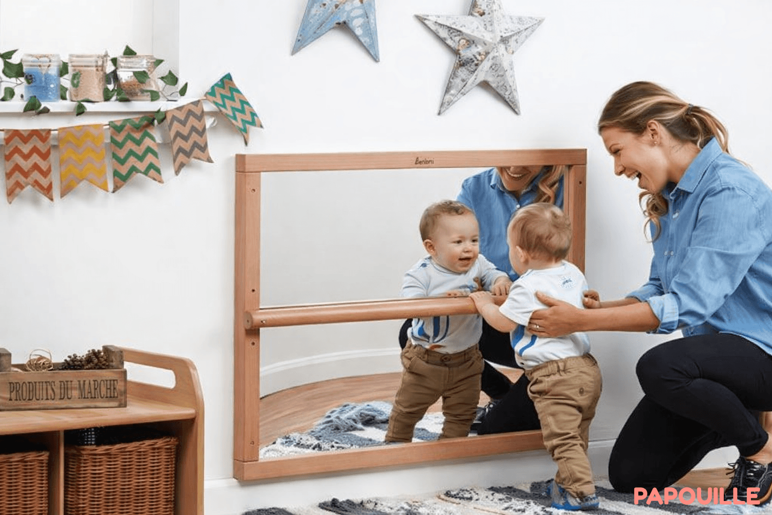Pensé pour encourager la motricité libre, ce miroir contribue au développement de la coordination, de l’équilibre et de la conscience de soi. En observant leur reflet, les bambins affinent leur perception corporelle, renforcent leur confiance en eux et développent leur éveil sensoriel. La main courante, facile à saisir et positionnable sur trois hauteurs (305 mm, 365 mm et 425 mm), accompagne les différentes étapes de la motricité globale, du redressement aux premiers appuis stables.