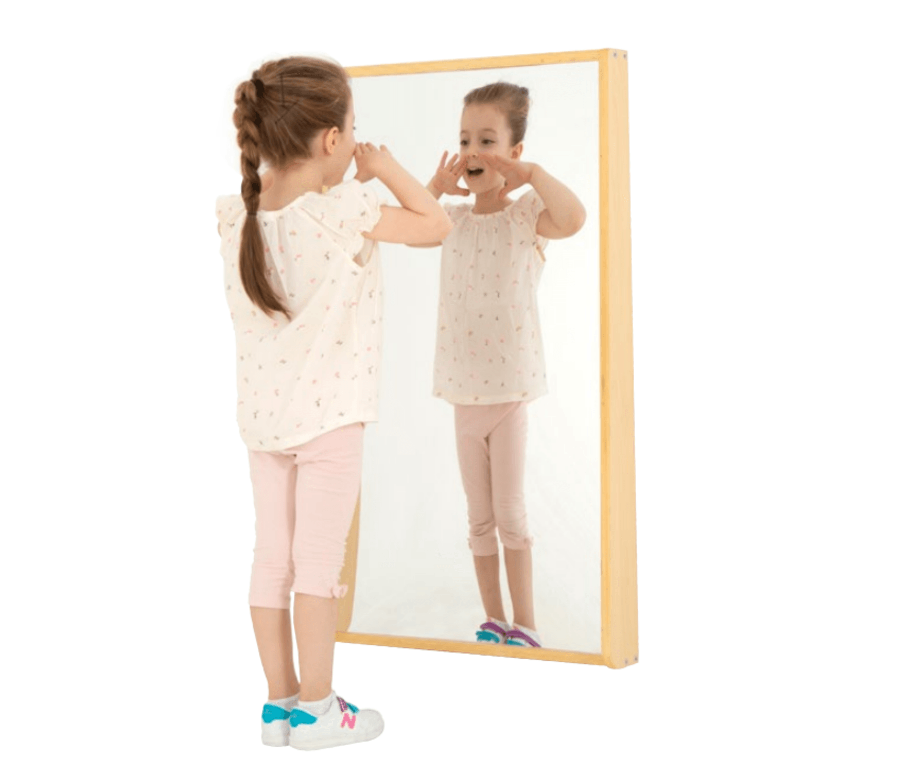 Sa surface en polycarbonate avec film miroir est particulièrement résistante, garantissant sécurité et durabilité, même dans les environnements très fréquentés. Contrairement aux miroirs en verre, ce matériau est incassable, ce qui en fait une option idéale pour les structures de la petite enfance. Le cadre en multiplex de peuplier avec finition mélamine érable apporte une touche esthétique chaleureuse tout en assurant une robustesse maximale.
