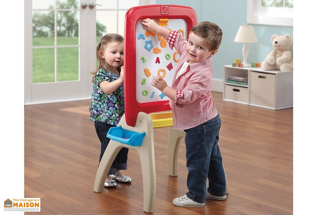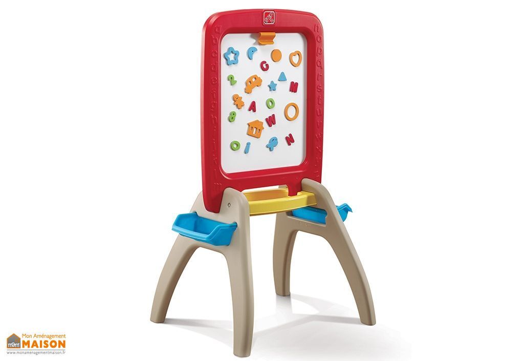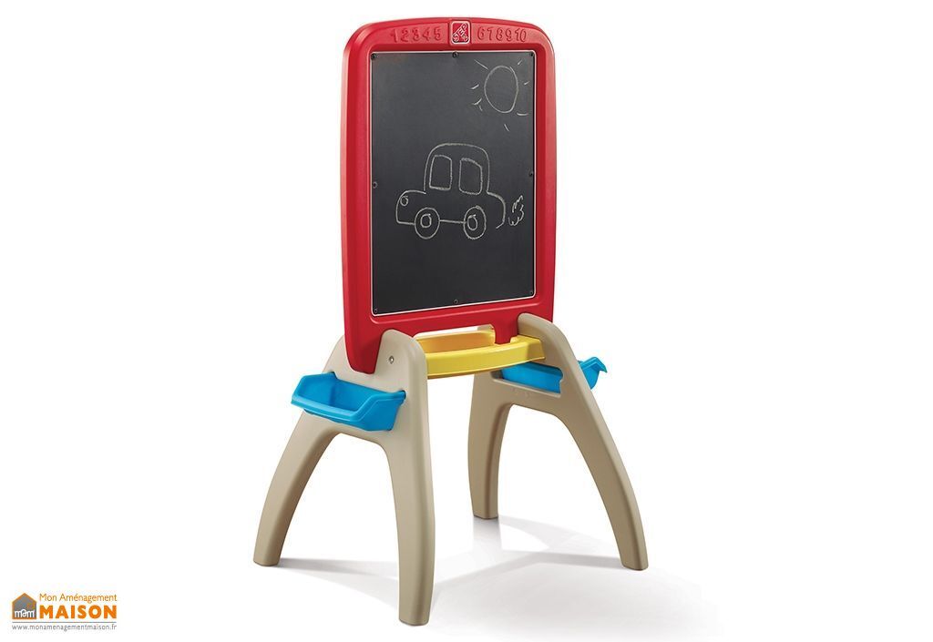 Le tableau pour enfant Step 2 est un tableau monté sur chevalet, 2 en 1. Il dispose d’un côté avec tableau noir pour écrire à la craie (non incluse) et d’un côté avec tableau blanc magnétisé. Un clip permet d’accrocher une feuille de papier pour dessiner au feutre ou au crayon de couleur comme sur un chevalet.